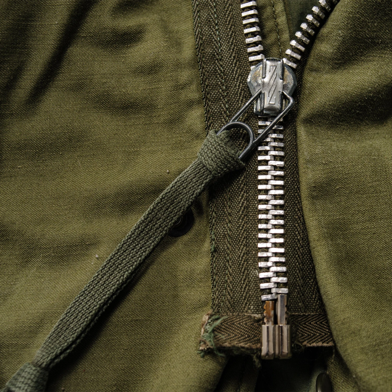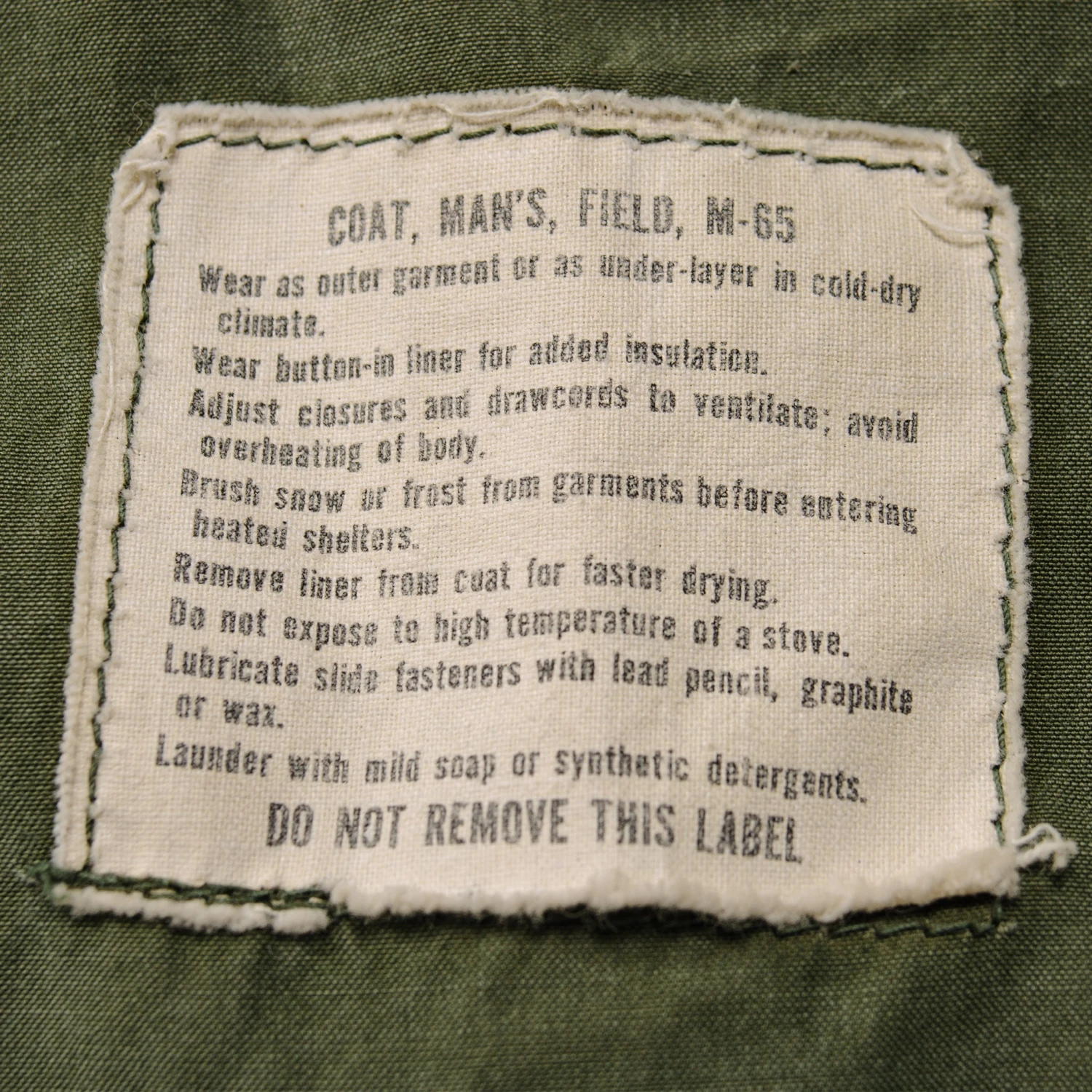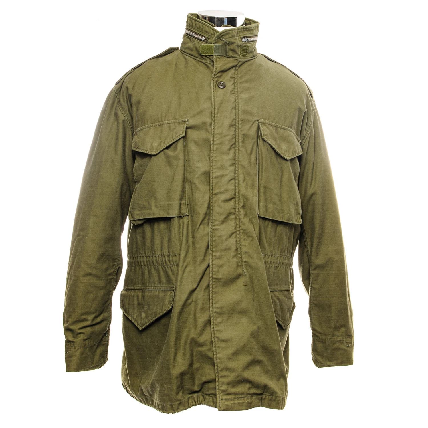 The hip length M1965 cold weather coat was made from OG-107 water repellent and wind resistant cotton-nylon sateen and had a zip front closure and Velcro cuff fasteners. The two bellows type chest pockets and two lower inside hanging pockets were closed by snap fasteners and the hood was zipped into the back of the coat’s rounded collar. Like its M1951 predecessor it had both waist and hem drawstrings and could be fitted with a detachable liner.