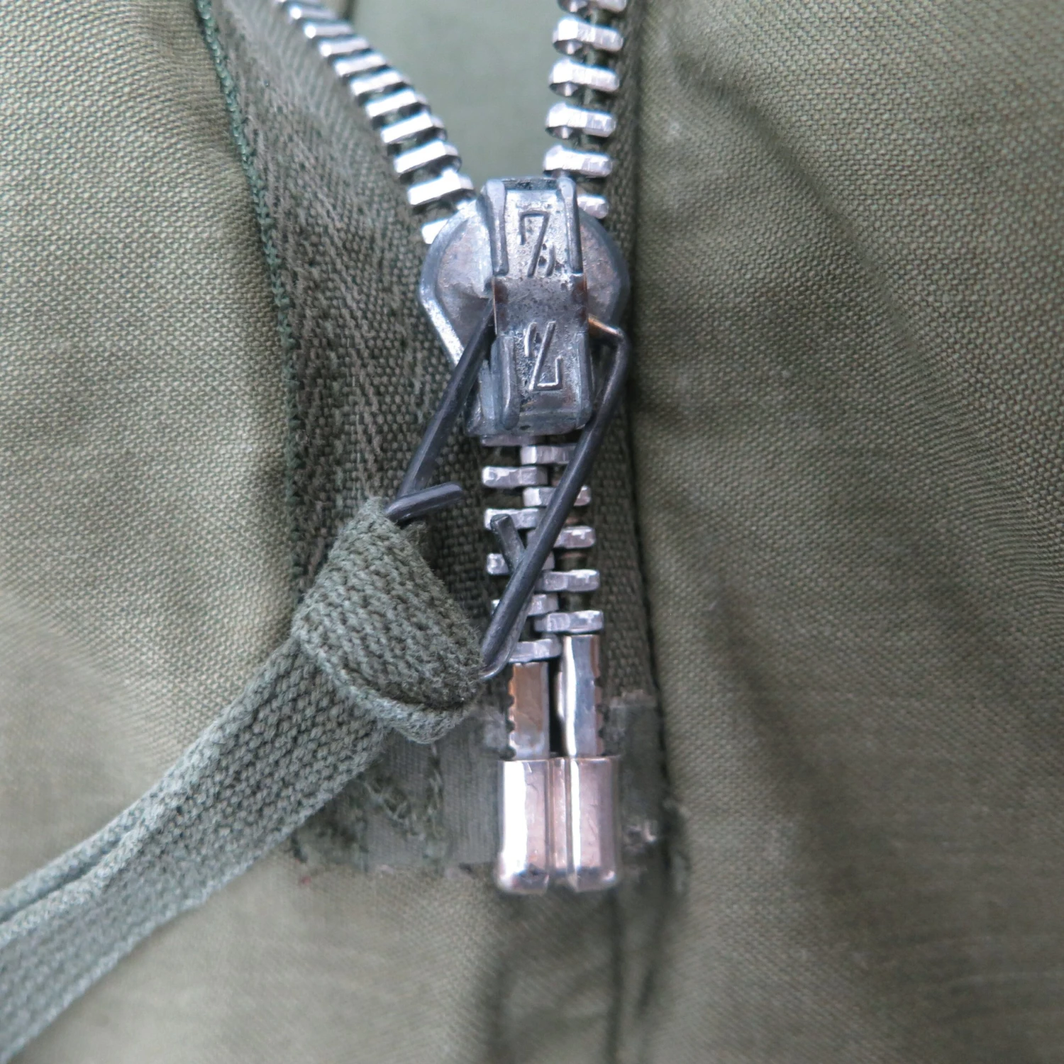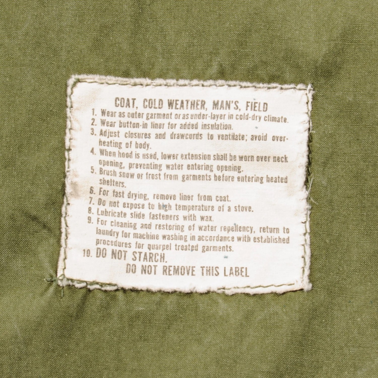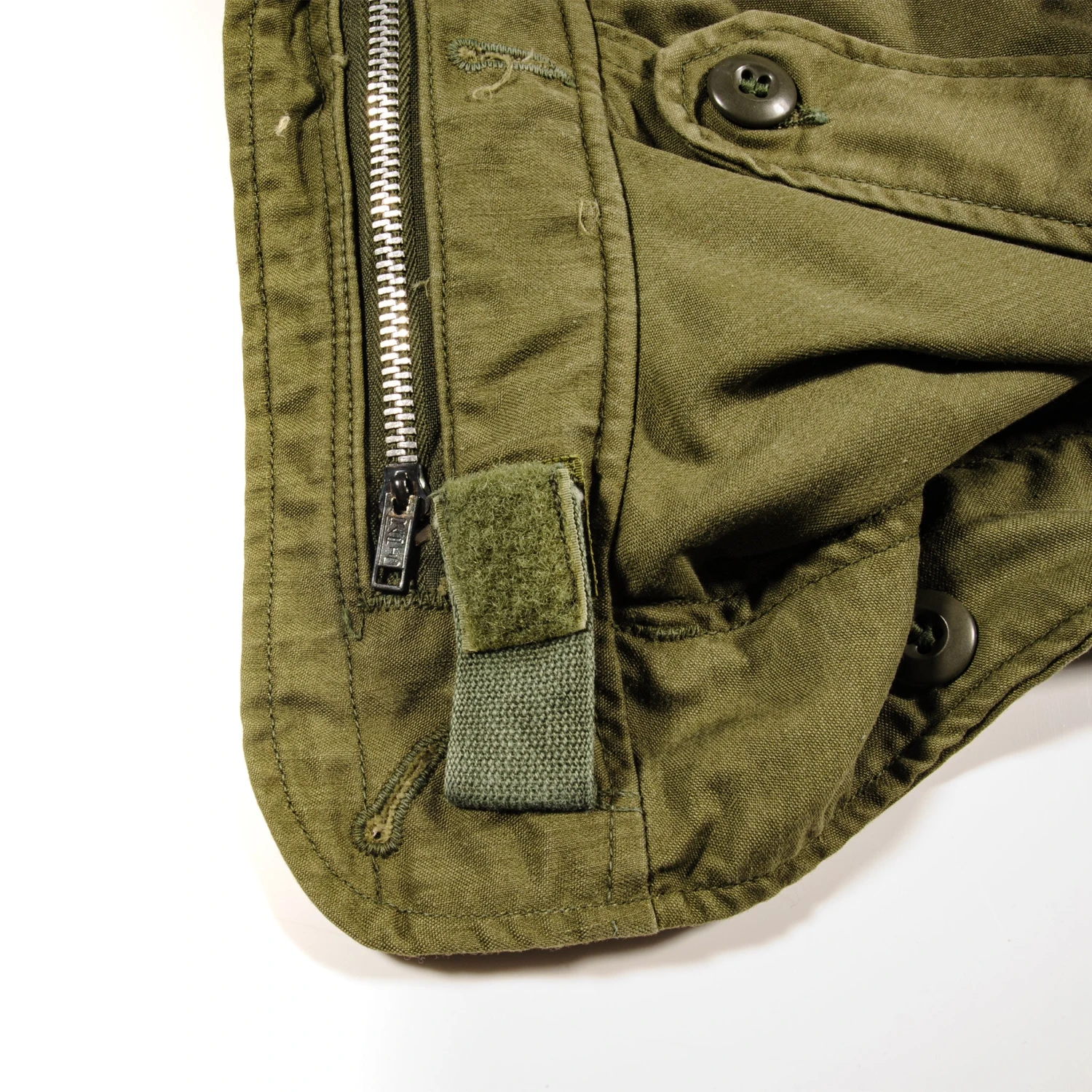 The hip length M1965 cold weather coat was made from OG-107 water repellent and wind resistant cotton-nylon sateen and had a zip front closure and Velcro cuff fasteners. The two bellows type chest pockets and two lower inside hanging pockets were closed by snap fasteners and the hood was zipped into the back of the coat’s rounded collar. Like its M1951 predecessor it had both waist and hem drawstrings and could be fitted with a detachable liner.