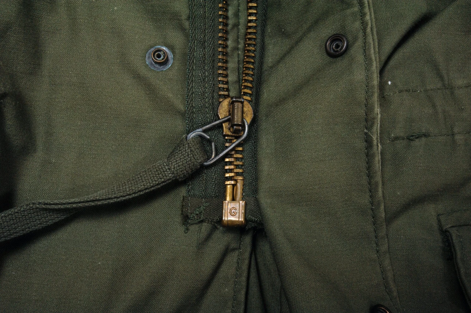 The hip length M1965 cold weather coat was made from OG-107 water repellent and wind resistant cotton-nylon sateen and had a zip front closure and Velcro cuff fasteners. The two bellows type chest pockets and two lower inside hanging pockets were closed by snap fasteners and the hood was zipped into the back of the coat’s rounded collar. Like its M1951 predecessor it had both waist and hem drawstrings and could be fitted with a detachable liner.