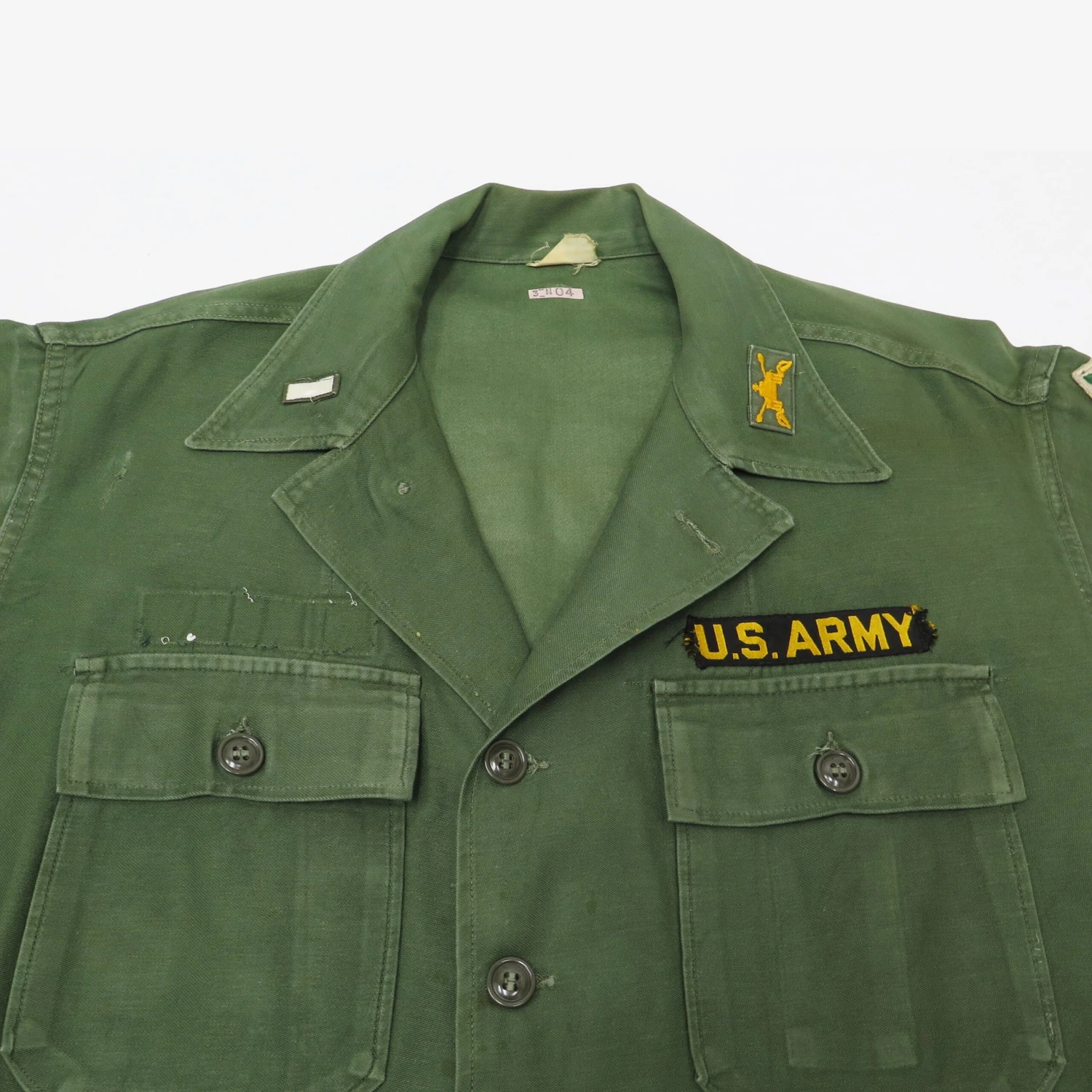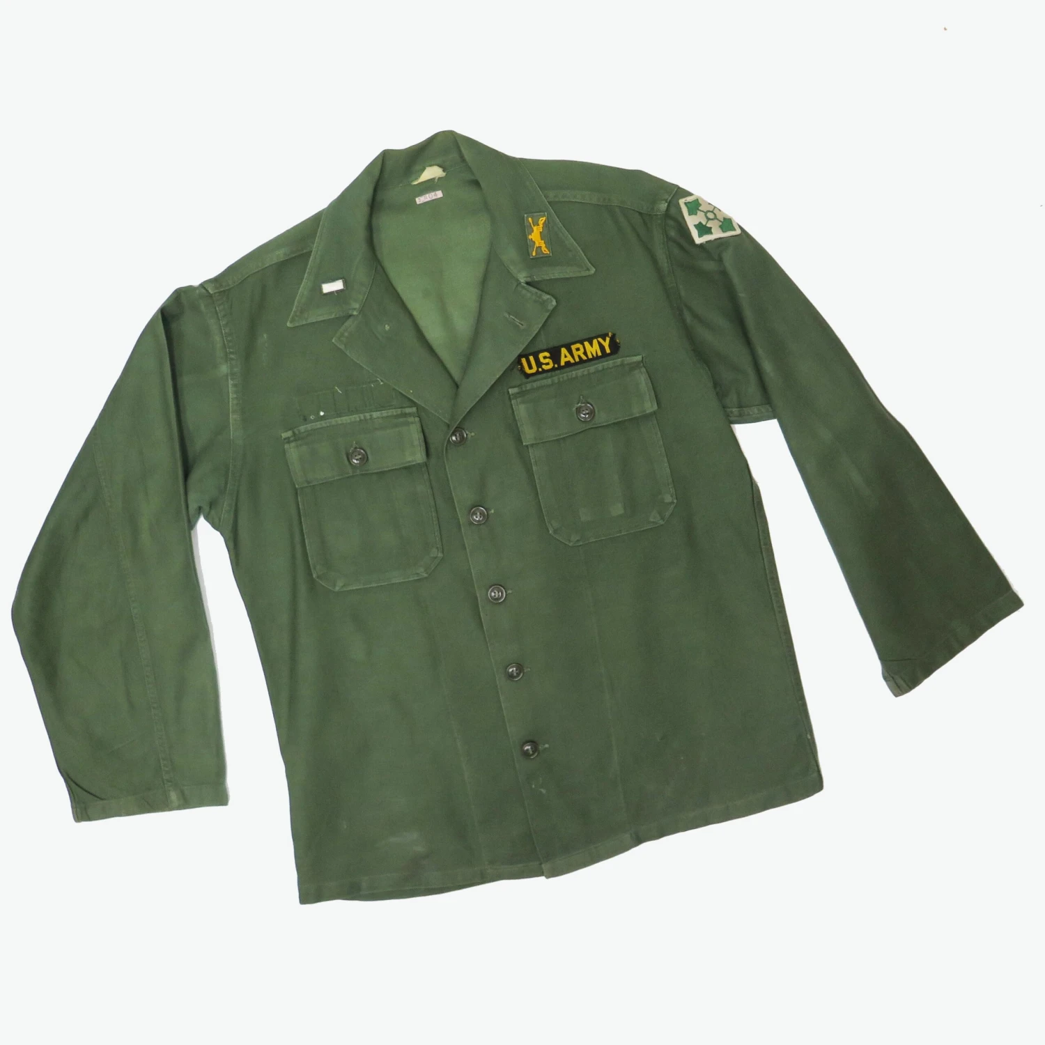 Vintage US Army Utility Shirt P58 1960’S Vietnam War with 4th Infantry Division Armor and Lieutenant patches.