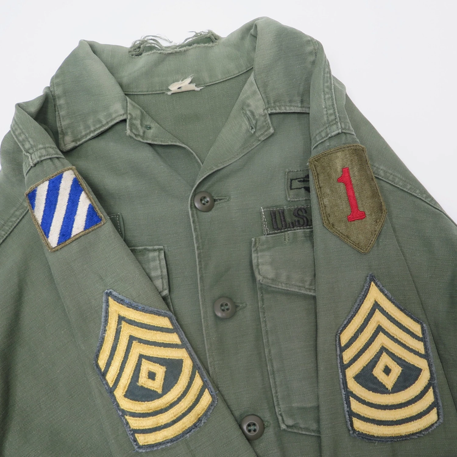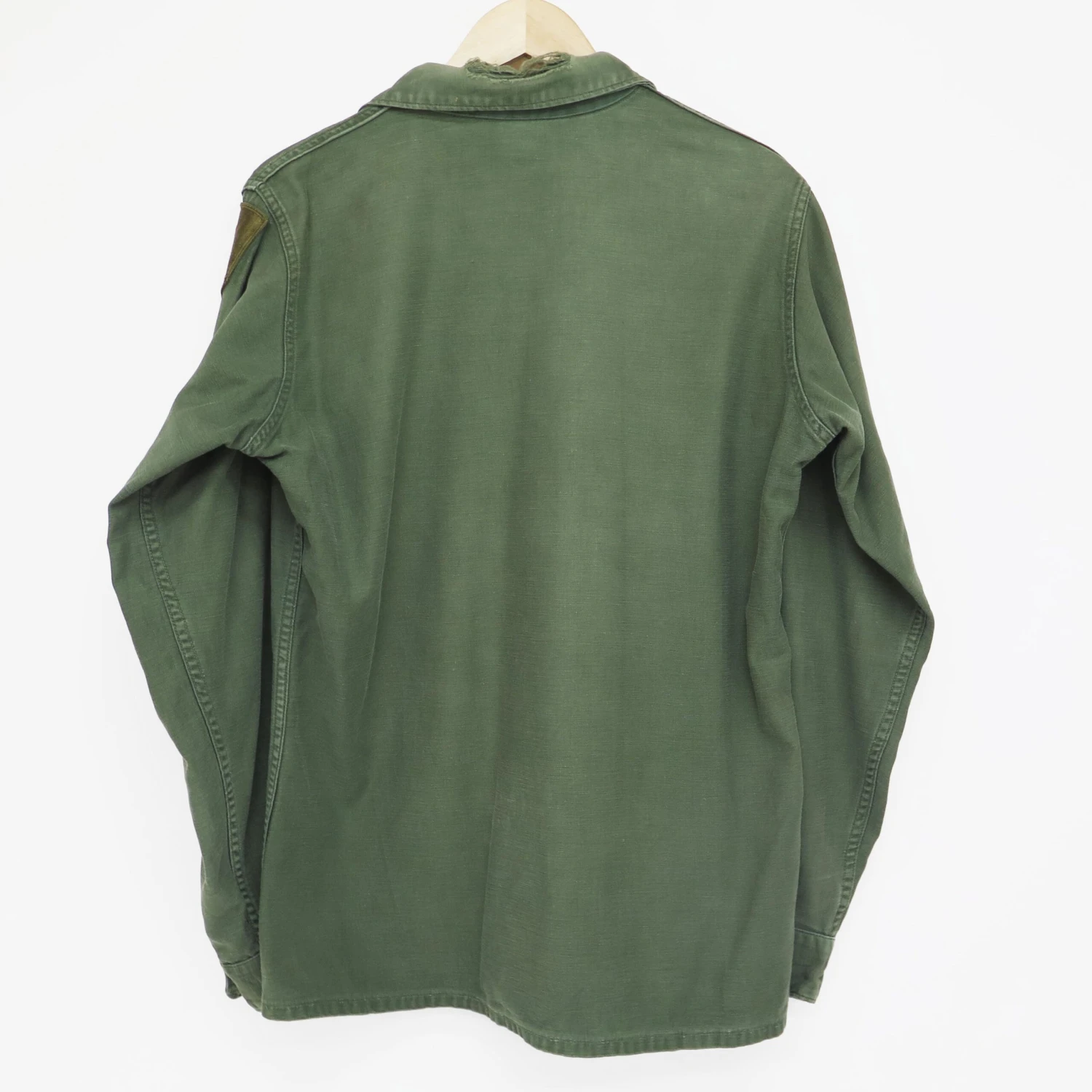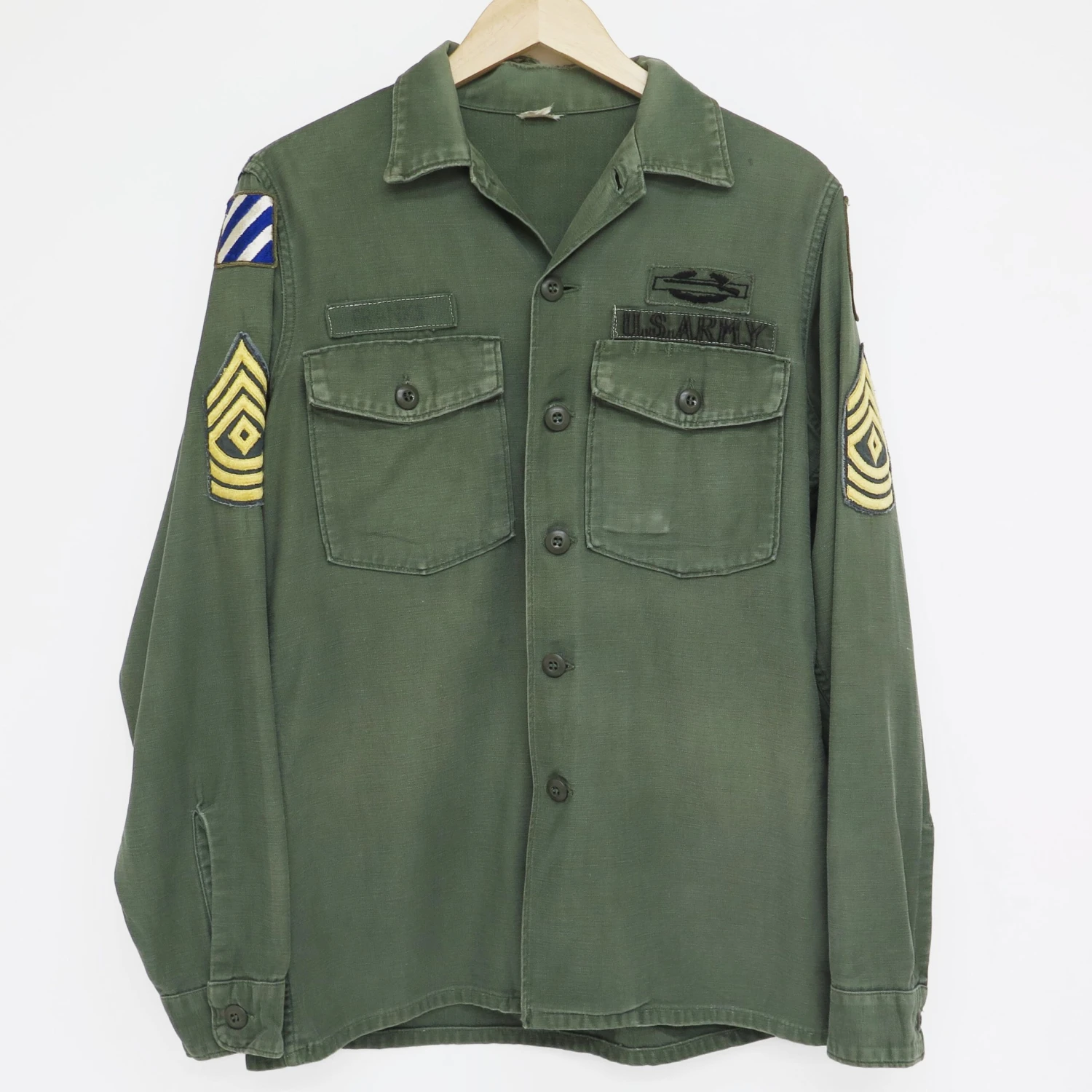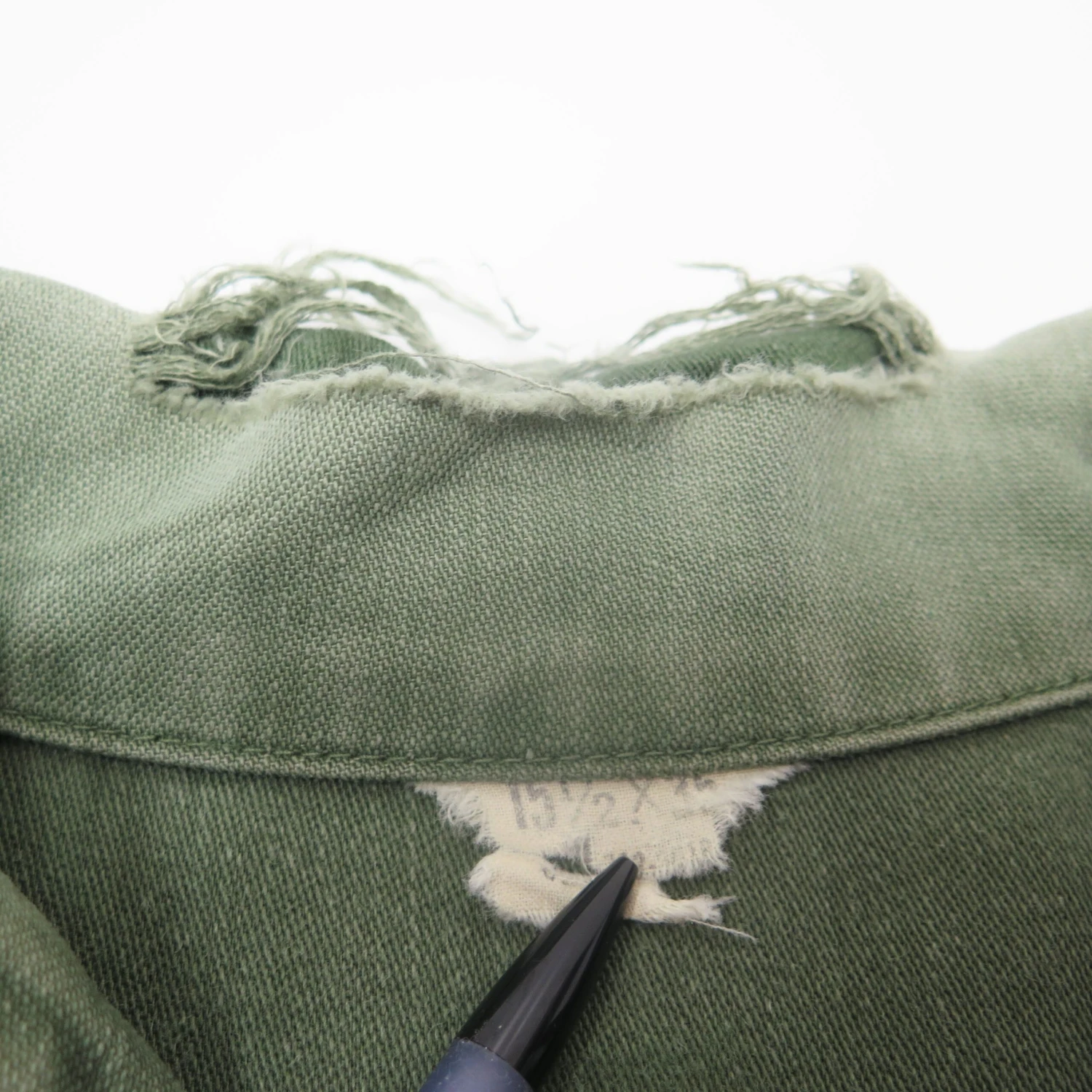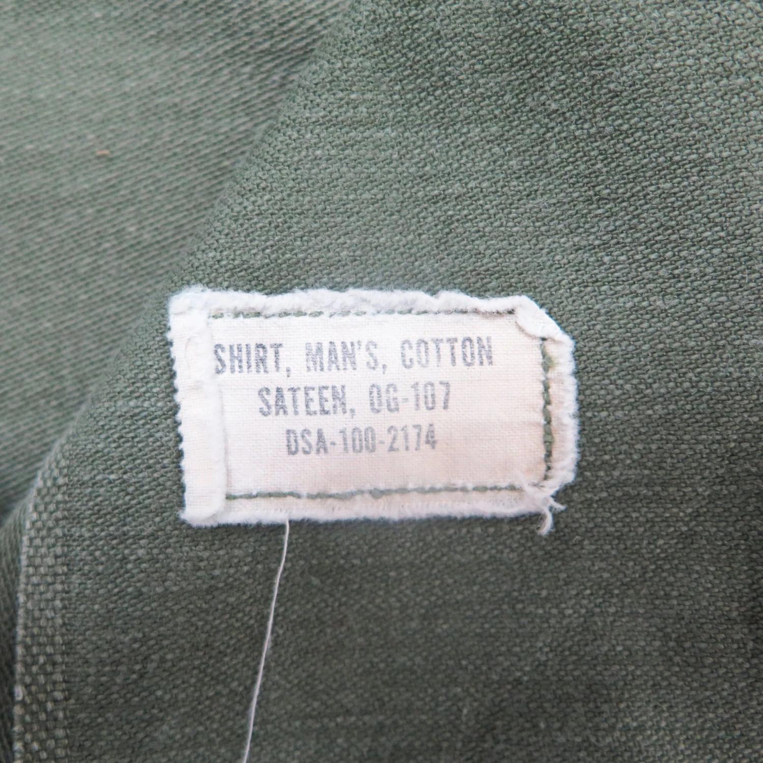 The 1964 design of the Utility Shirt featured V-cut pocket flaps, cuffed sleeves and domed plastic summarys.1 Like its predecessor, it was made from olive green (OG-107) 8.8oz cotton sateen.