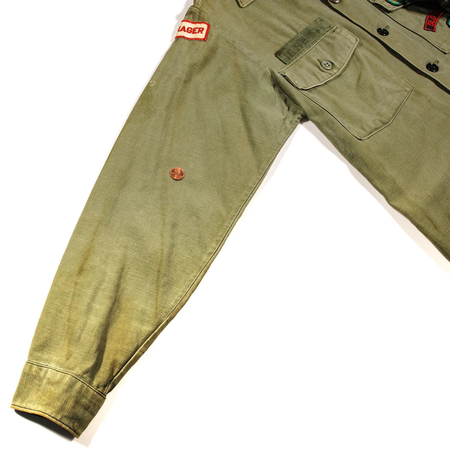 The 1964 design of the Utility Shirt featured V-cut pocket flaps, cuffed sleeves and domed plastic summarys.1 Like its predecessor, it was made from olive green (OG-107) 8.8oz cotton sateen.