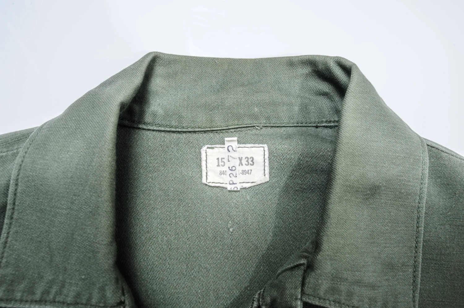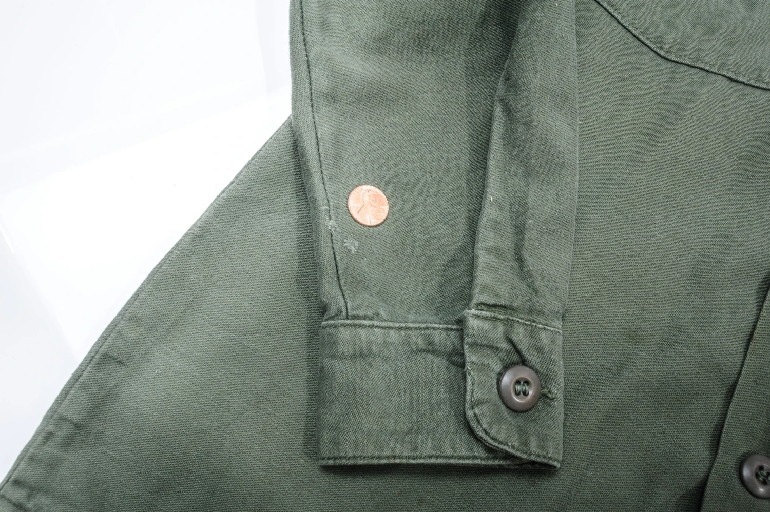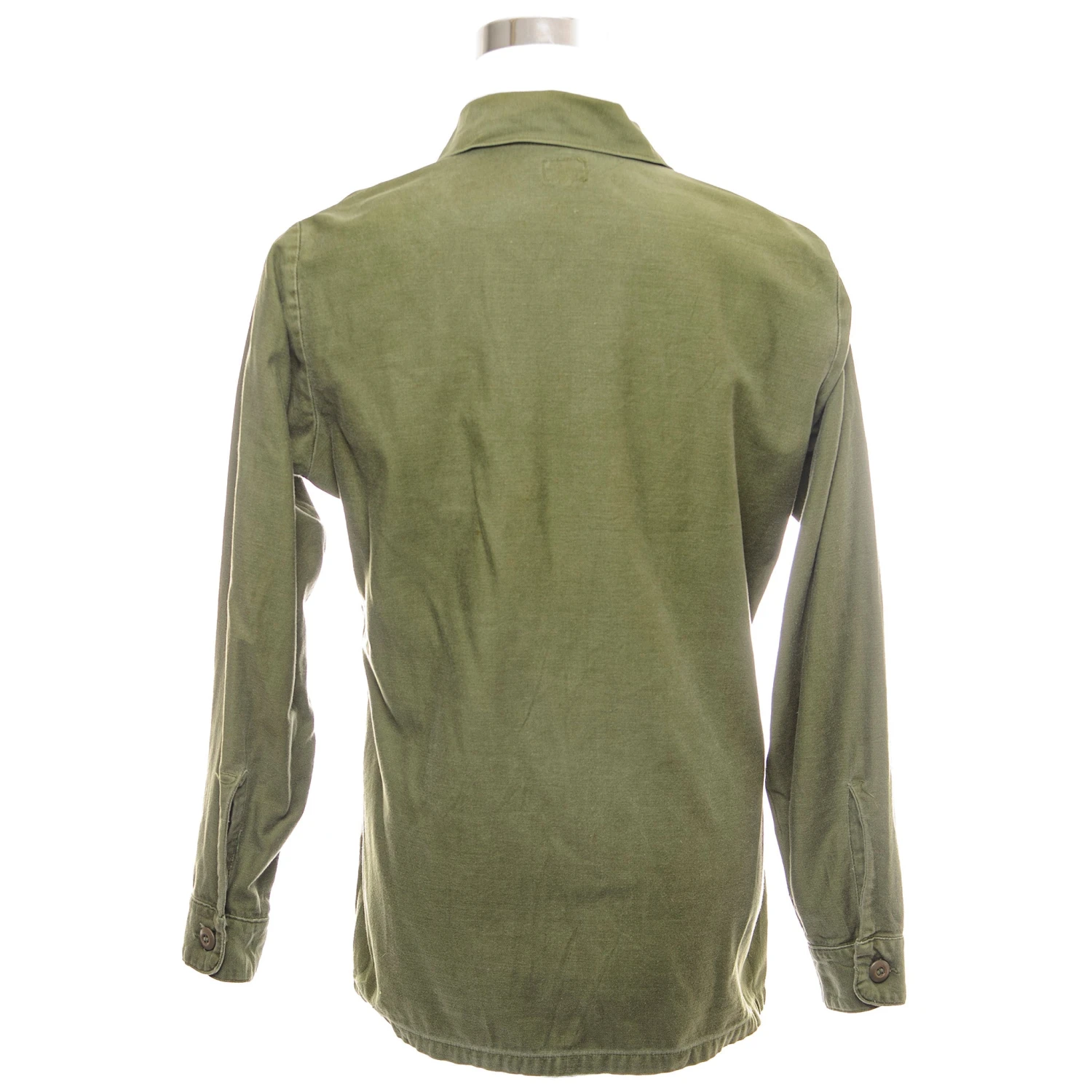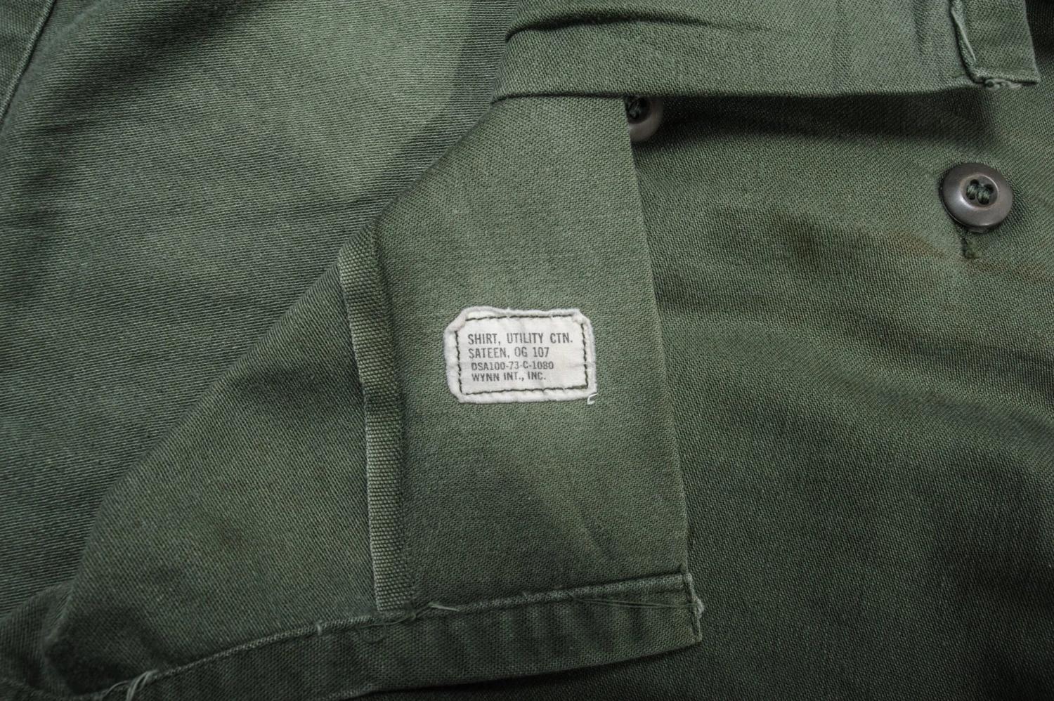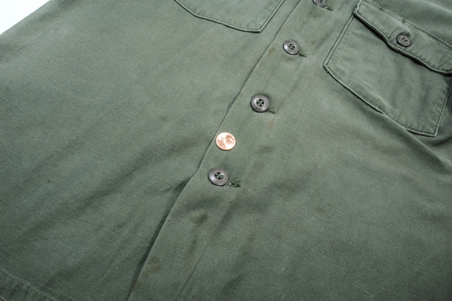 The 1964 design of the Utility Shirt featured V-cut pocket flaps, cuffed sleeves and domed plastic summarys.1 Like its predecessor, it was made from olive green (OG-107) 8.8oz cotton sateen.