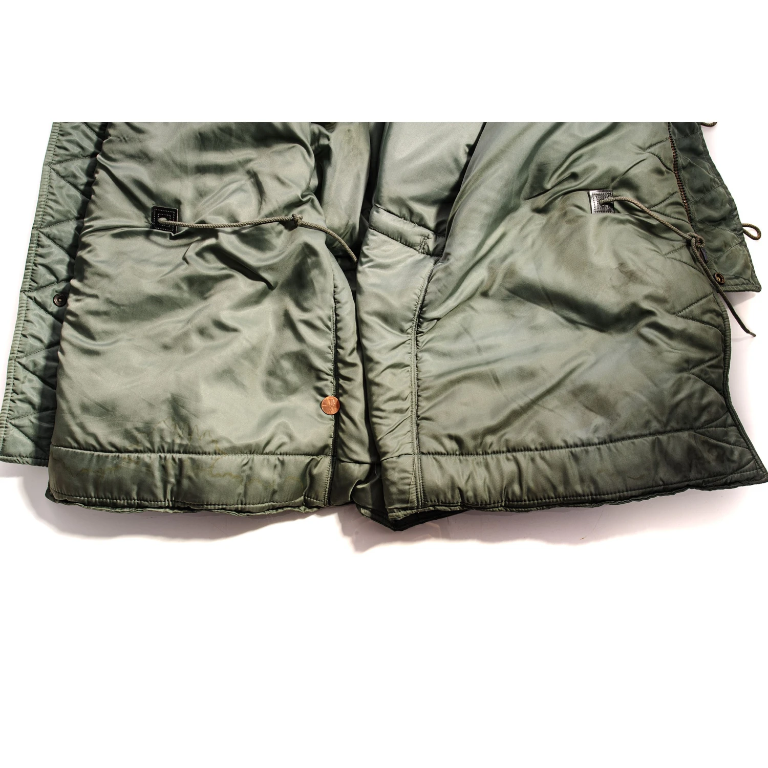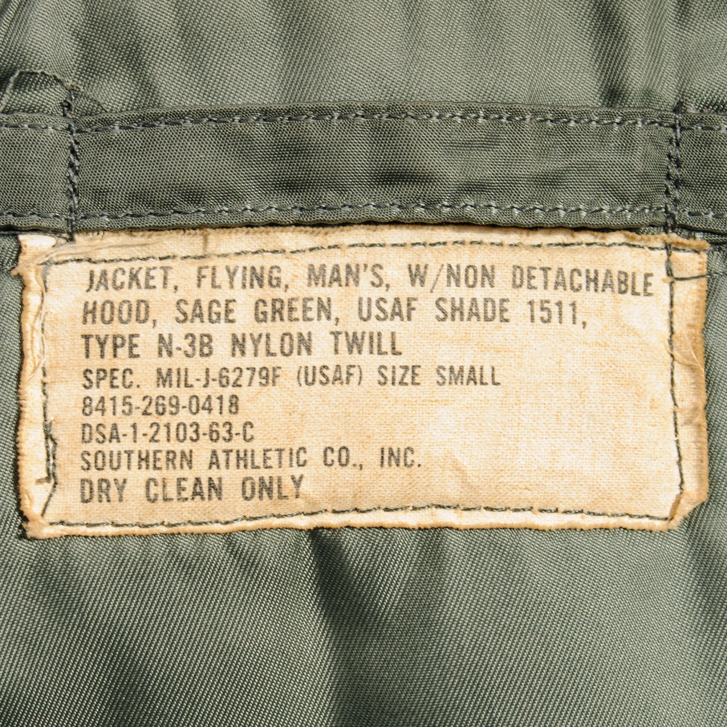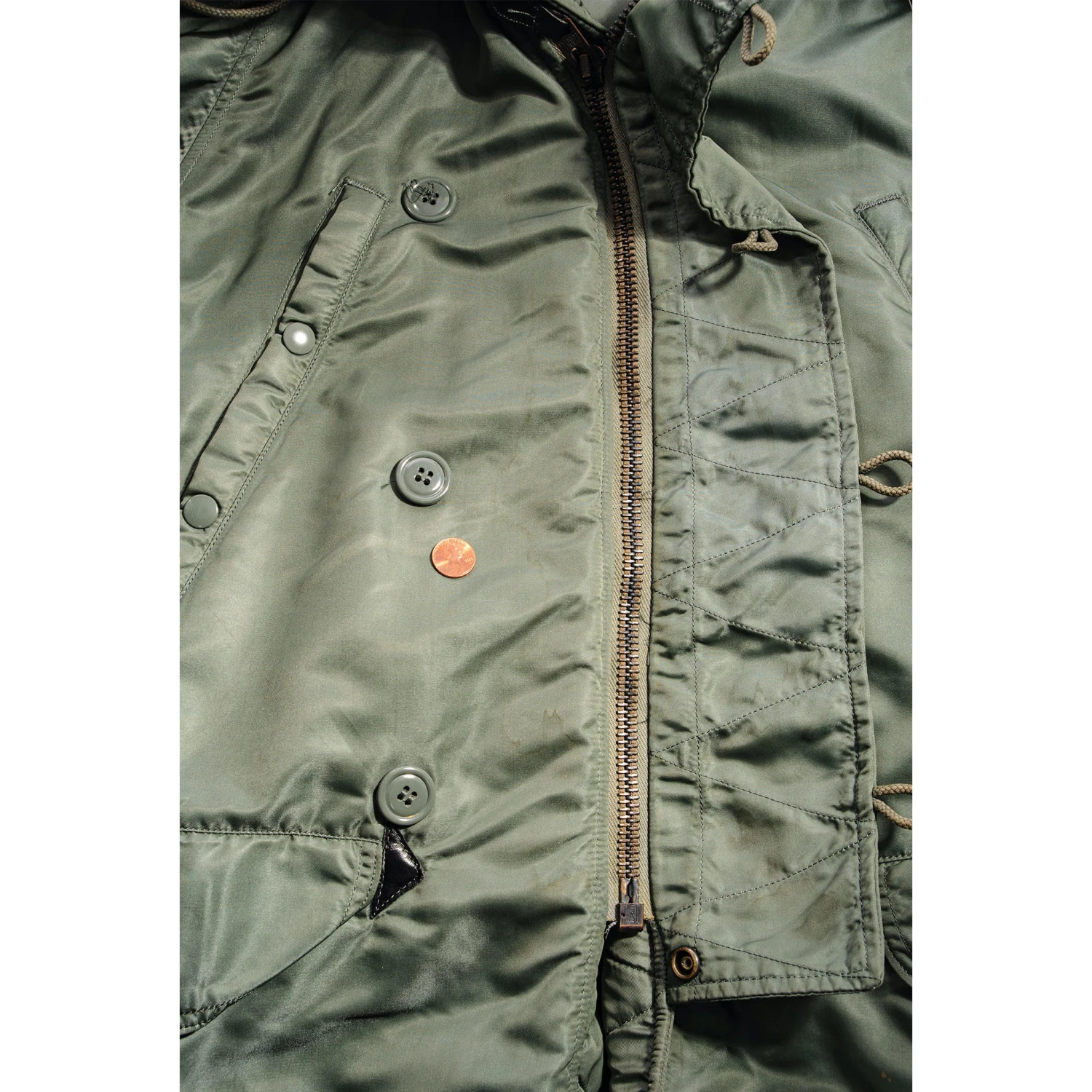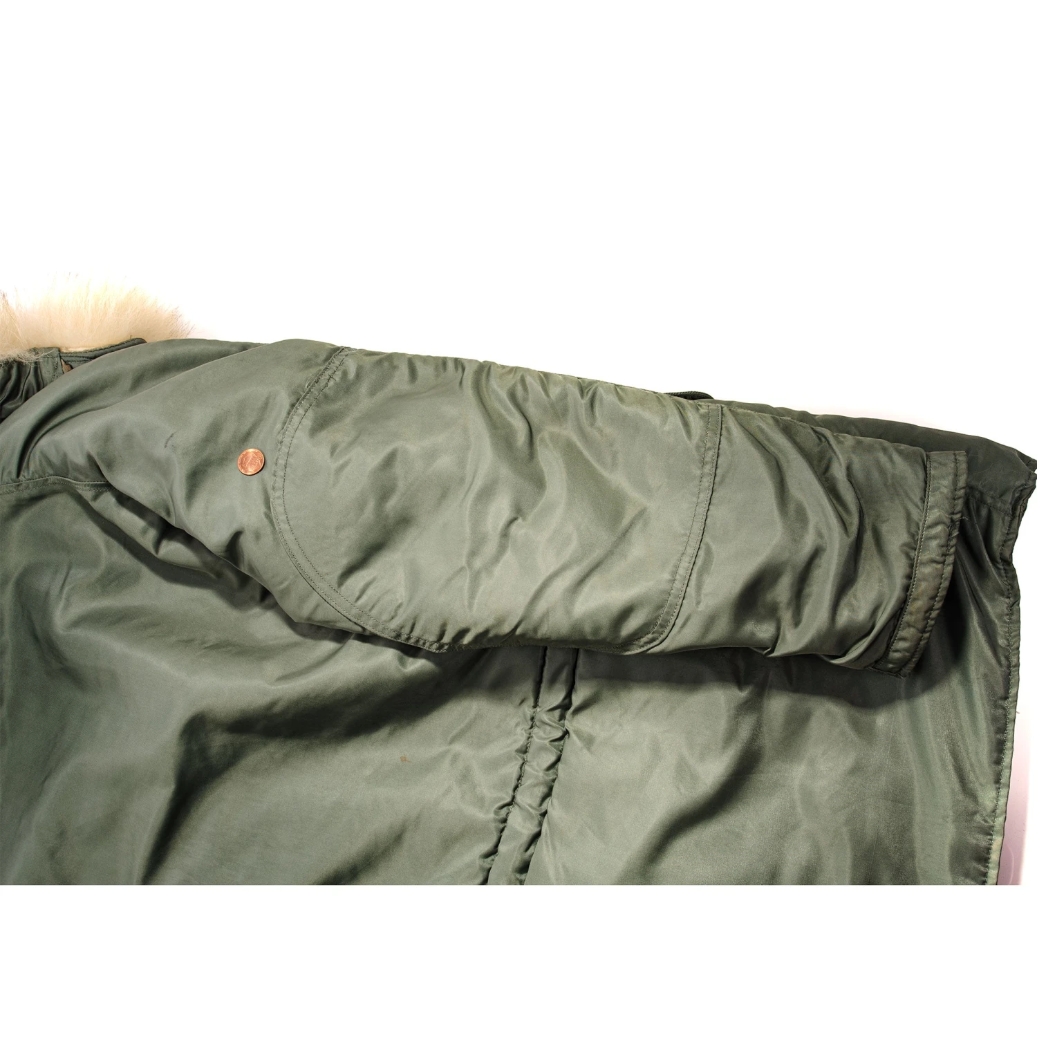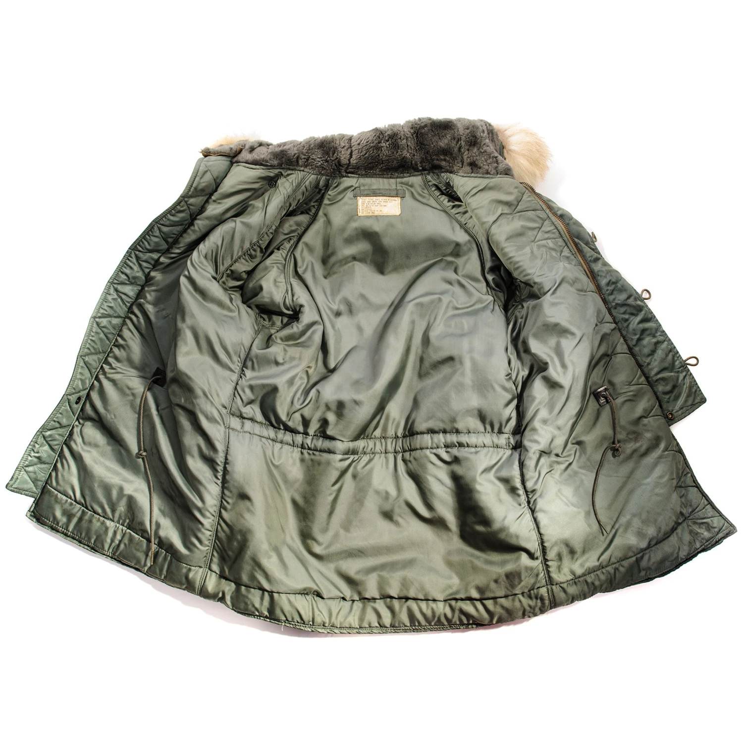 The N-3 evolved into the N-3B by 1958, described as “for aircrew members in extremely cold environments.” The N-3B was a single breasted, four pocket, 3/4 length parka with an outer layer of nylon twill (typically sage green), insulated with a layer of wool pile fabric and lined with nylon cloth.