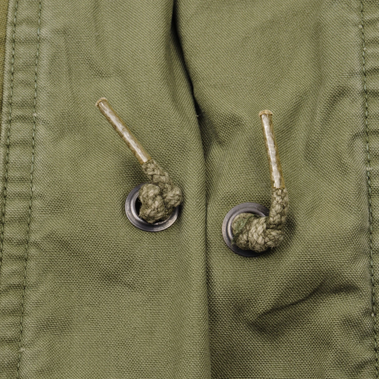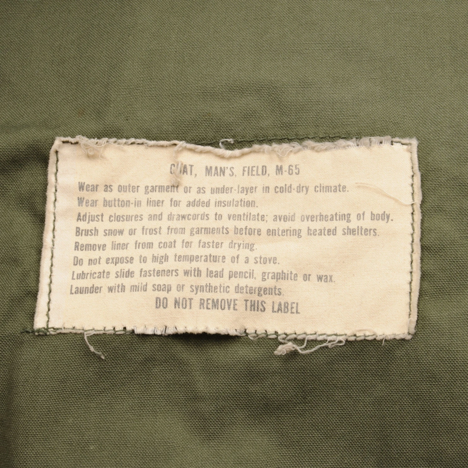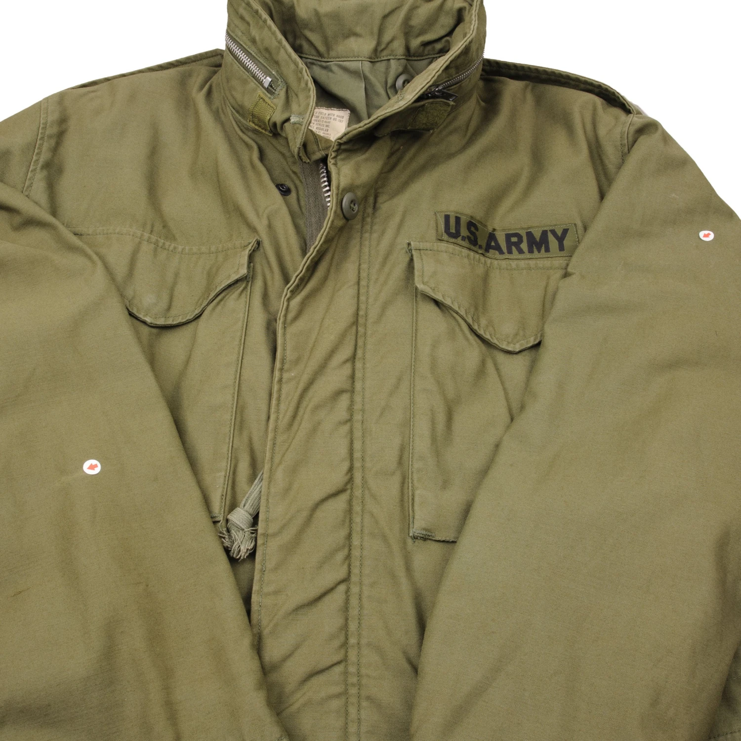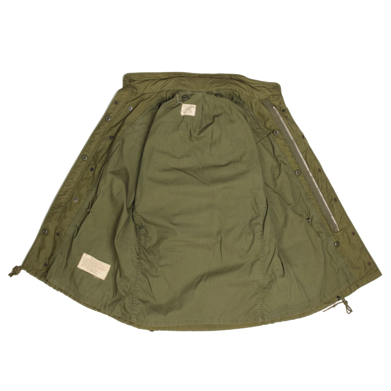 The hip length M1965 cold weather coat was made from OG-107 water repellent and wind resistant cotton-nylon sateen and had a zip front closure and Velcro cuff fasteners. The two bellows type chest pockets and two lower inside hanging pockets were closed by snap fasteners and the hood was zipped into the back of the coat’s rounded collar. Like its M1951 predecessor it had both waist and hem drawstrings and could be fitted with a detachable liner.