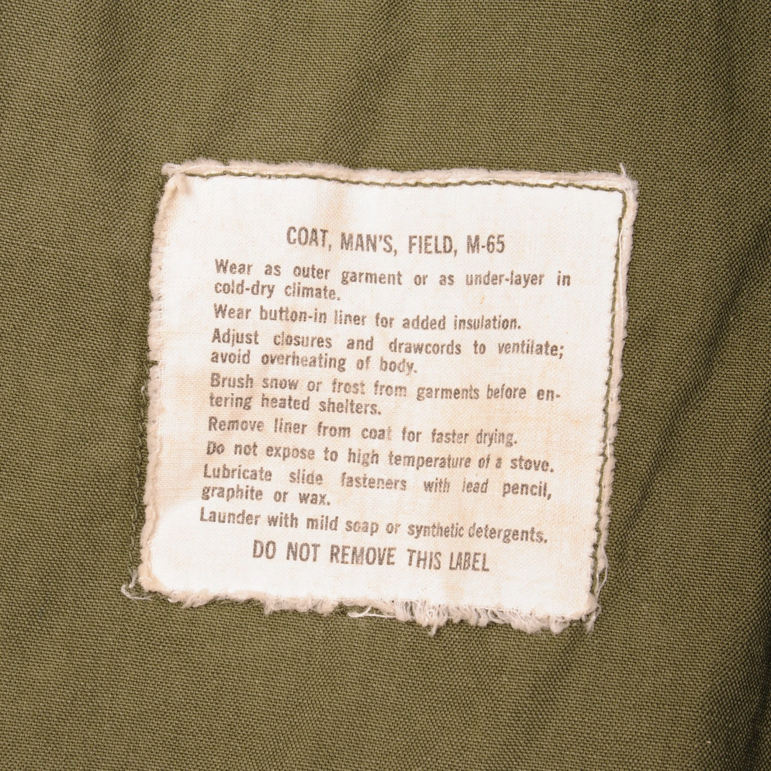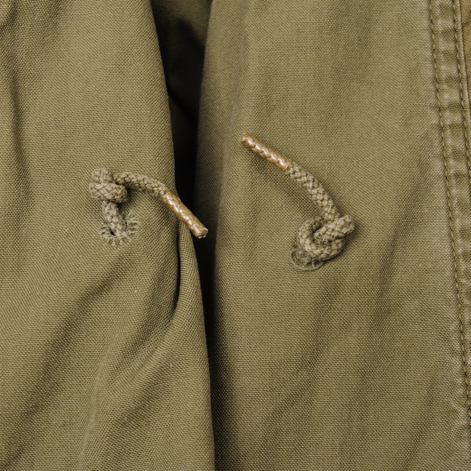 The hip length M1965 cold weather coat was made from OG-107 water repellent and wind resistant cotton-nylon sateen and had a zip front closure and Velcro cuff fasteners. The two bellows type chest pockets and two lower inside hanging pockets were closed by snap fasteners and the hood was zipped into the back of the coat’s rounded collar. Like its M1951 predecessor it had both waist and hem drawstrings and could be fitted with a detachable liner.