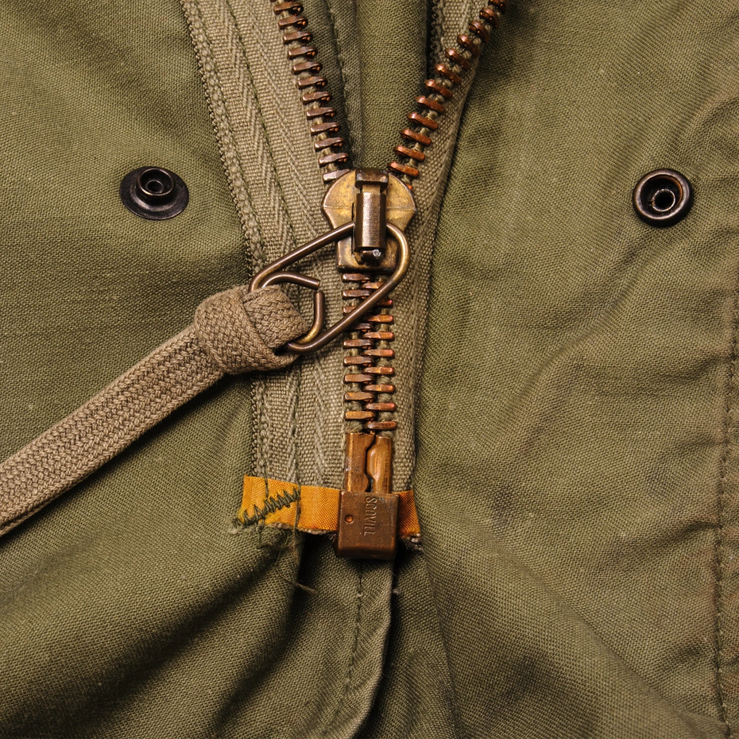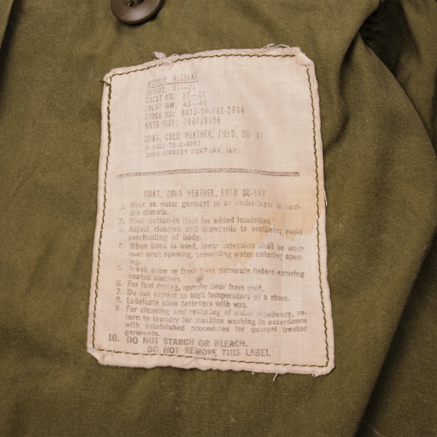 The hip length M1965 cold weather coat was made from OG-107 water repellent and wind resistant cotton-nylon sateen and had a zip front closure and Velcro cuff fasteners. The two bellows type chest pockets and two lower inside hanging pockets were closed by snap fasteners and the hood was zipped into the back of the coat’s rounded collar. Like its M1951 predecessor it had both waist and hem drawstrings and could be fitted with a detachable liner.