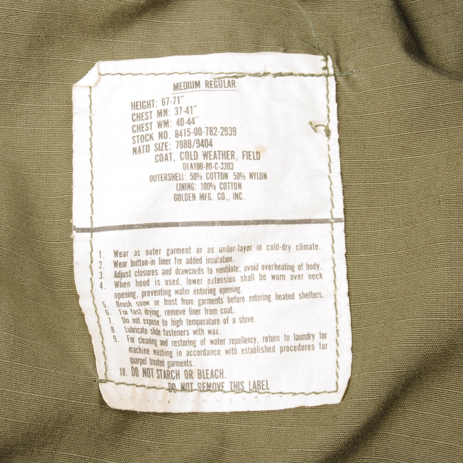 The M-1965 jacket was initially designed by Alpha Industries and was made from OG-107 (Olive Green Shade 107) water repellent and wind resistant cotton-nylon sateen. The fabrics was made by Burlington Fabrics.