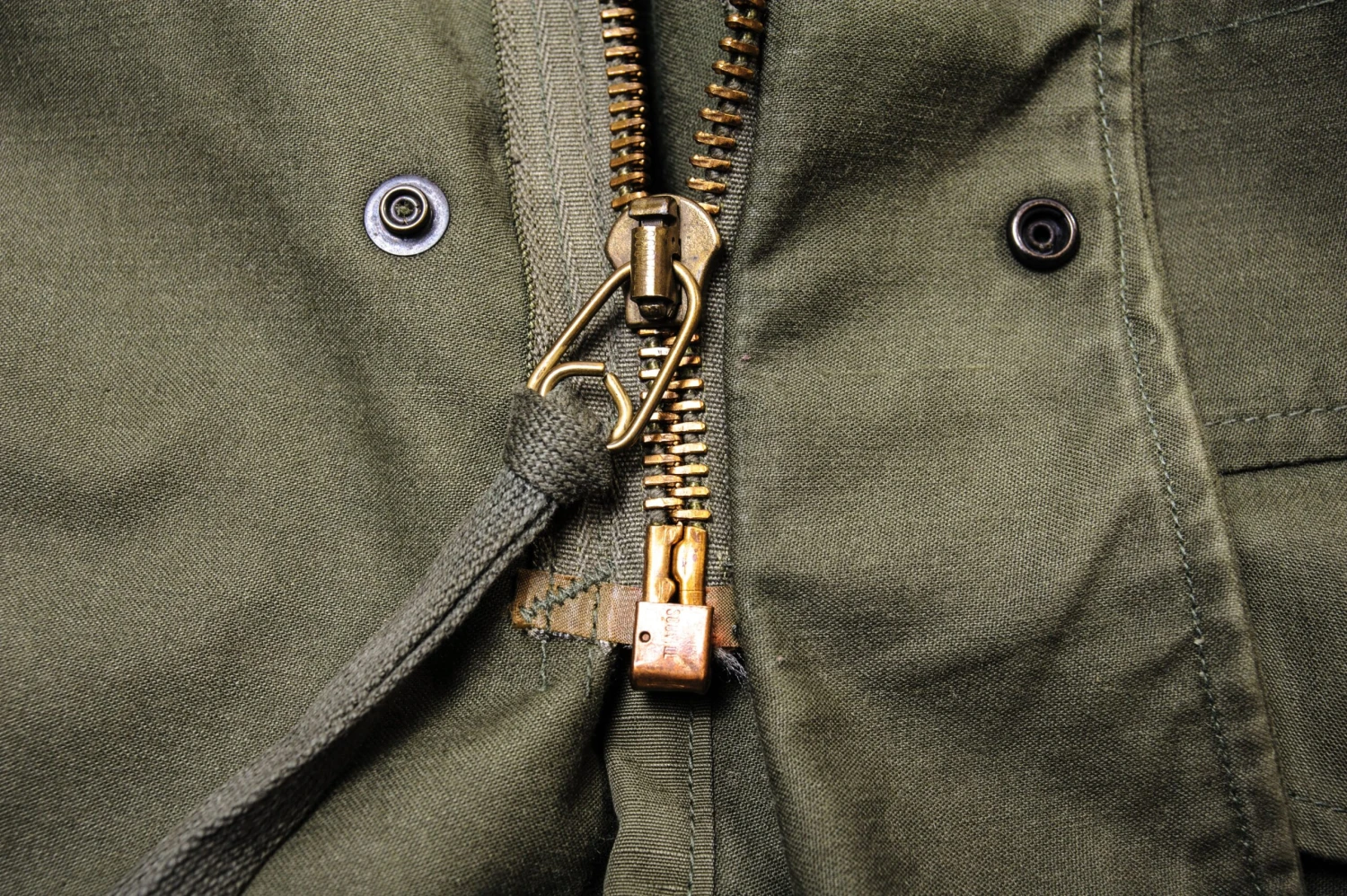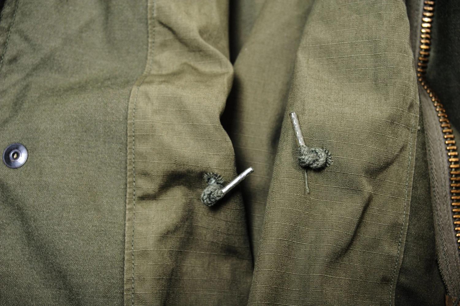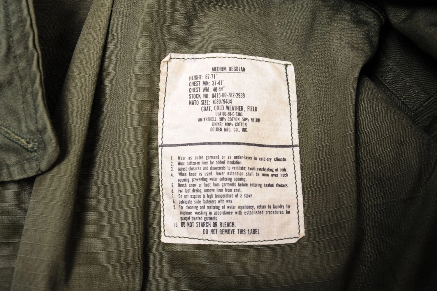The hip length M1965 cold weather coat was made from OG-107 water repellent and wind resistant cotton-nylon sateen and had a zip front closure and Velcro cuff fasteners. The two bellows type chest pockets and two lower inside hanging pockets were closed by snap fasteners and the hood was zipped into the back of the coat’s rounded collar. Like its M1951 predecessor it had both waist and hem drawstrings and could be fitted with a detachable liner.