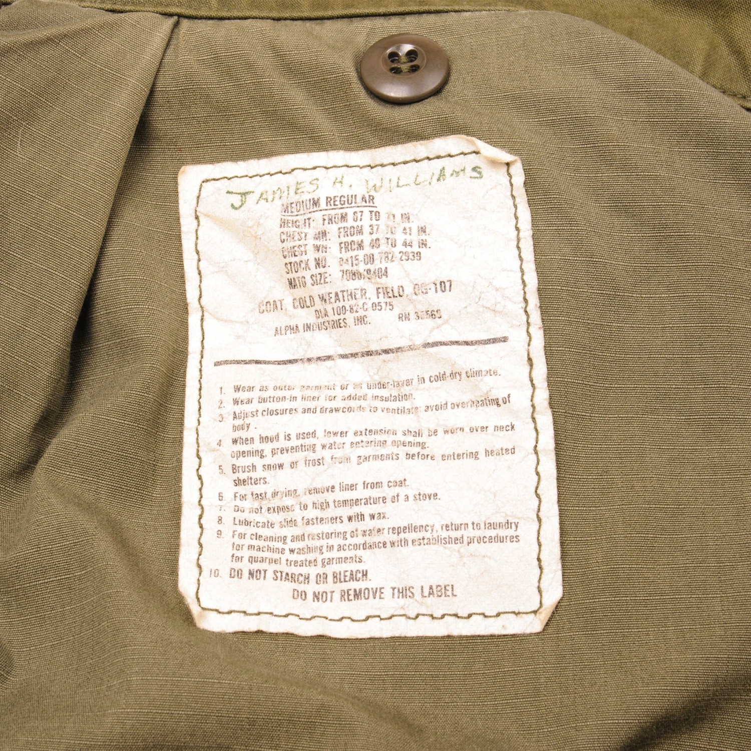 The hip length M1965 cold weather coat was made from OG-107 water repellent and wind resistant cotton-nylon sateen and had a zip front closure and Velcro cuff fasteners. The two bellows type chest pockets and two lower inside hanging pockets were closed by snap fasteners and the hood was zipped into the back of the coat’s rounded collar. Like its M1951 predecessor it had both waist and hem drawstrings and could be fitted with a detachable liner.