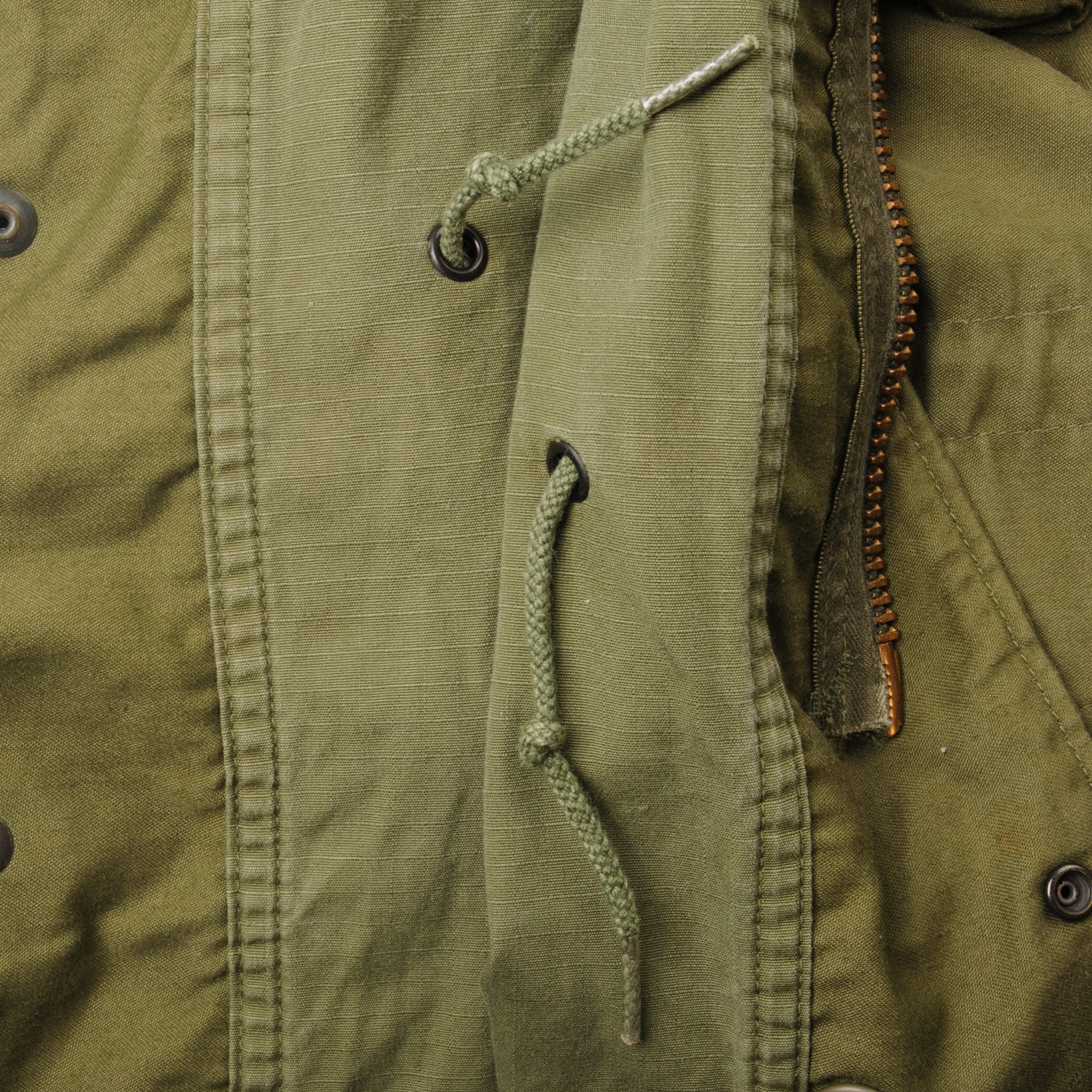The hip length M1965 cold weather coat was made from OG-107 water repellent and wind resistant cotton-nylon sateen and had a zip front closure and Velcro cuff fasteners. The two bellows type chest pockets and two lower inside hanging pockets were closed by snap fasteners and the hood was zipped into the back of the coat’s rounded collar. Like its M1951 predecessor it had both waist and hem drawstrings and could be fitted with a detachable liner.