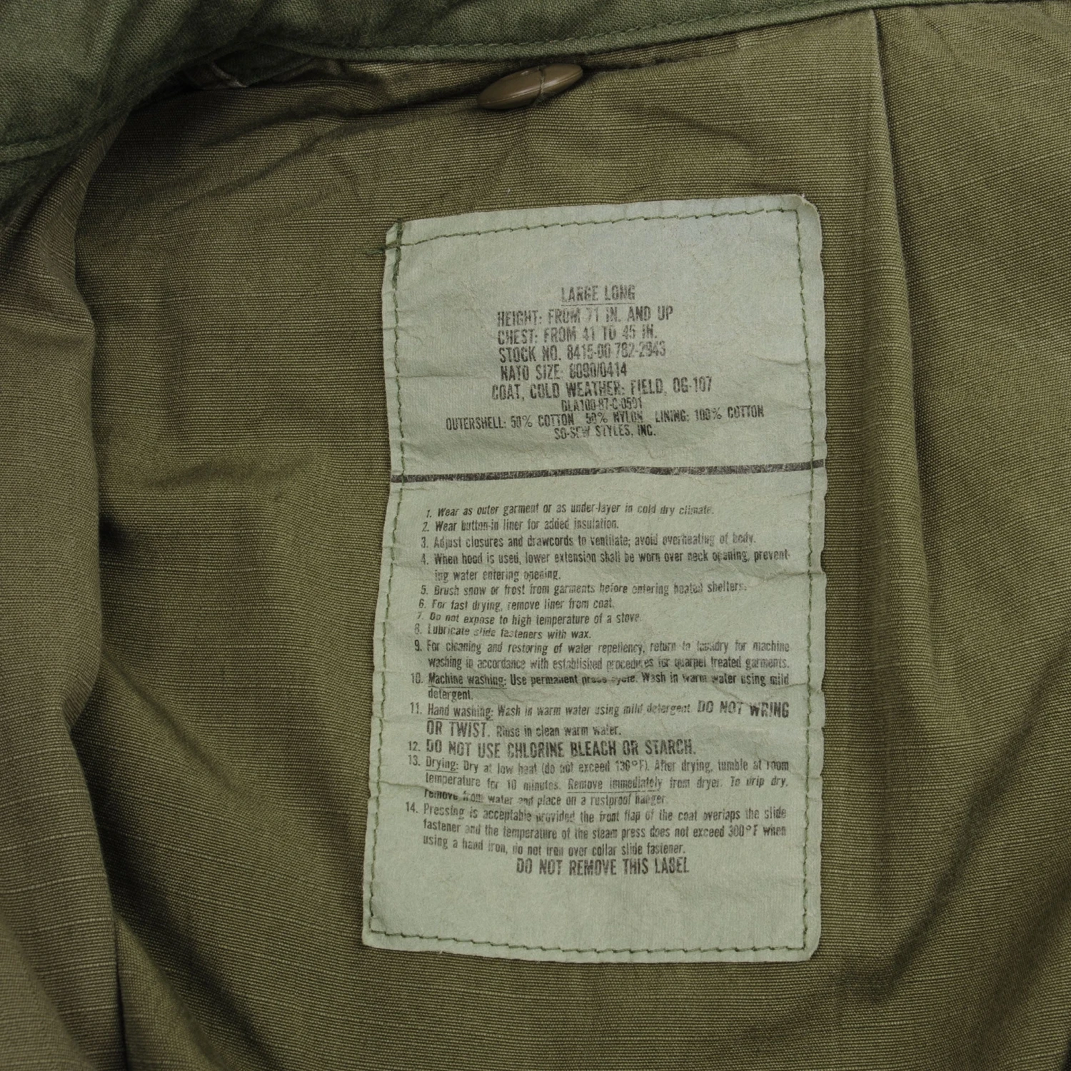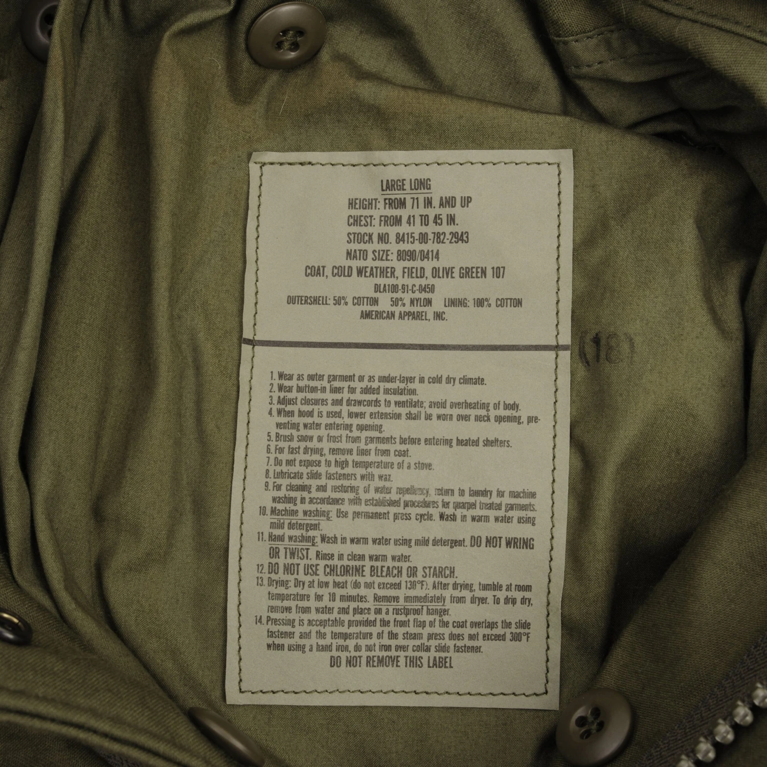 Vintage Us Army M-1965 M65 Field Jacket 1987 Size Large Long With Liner. YKK zipper