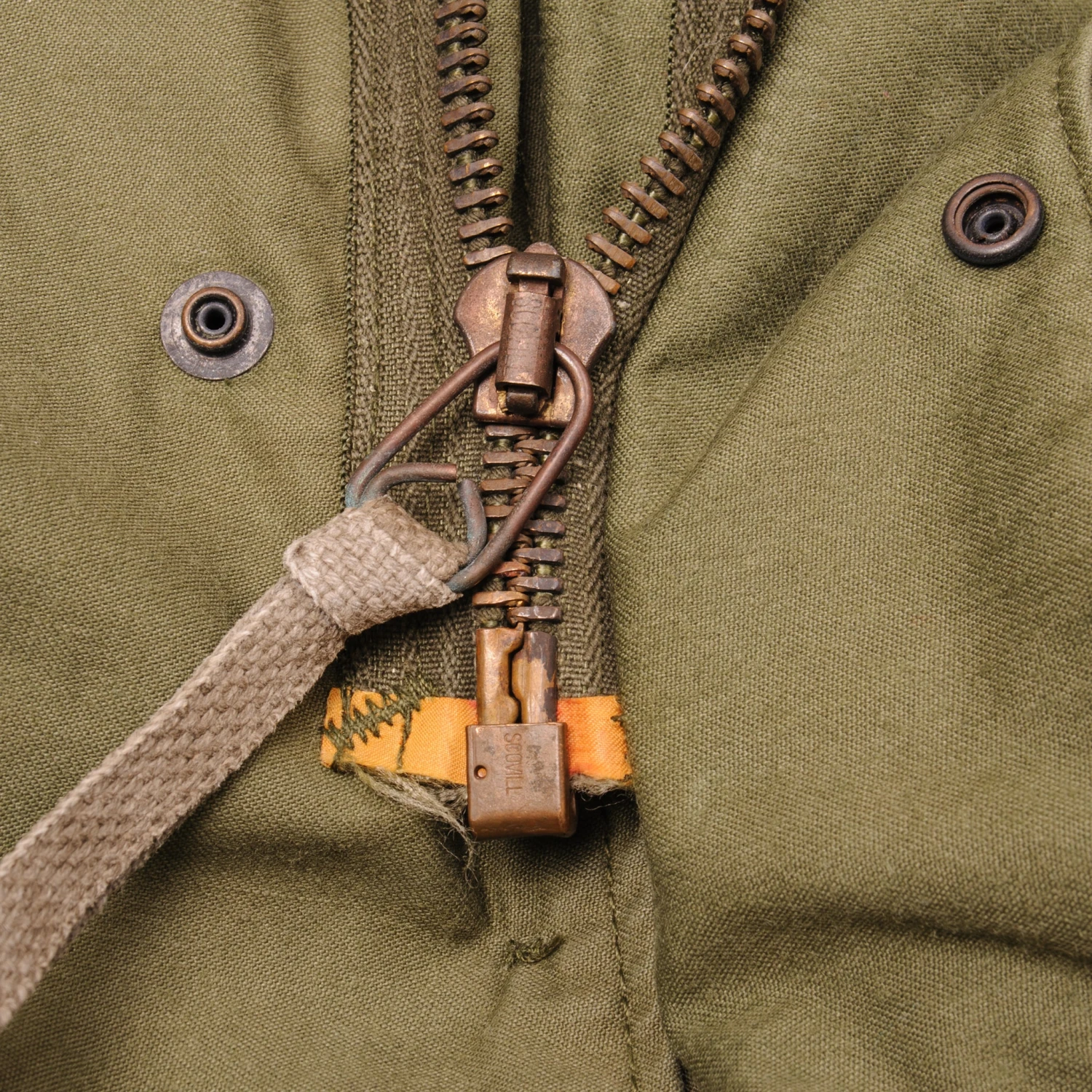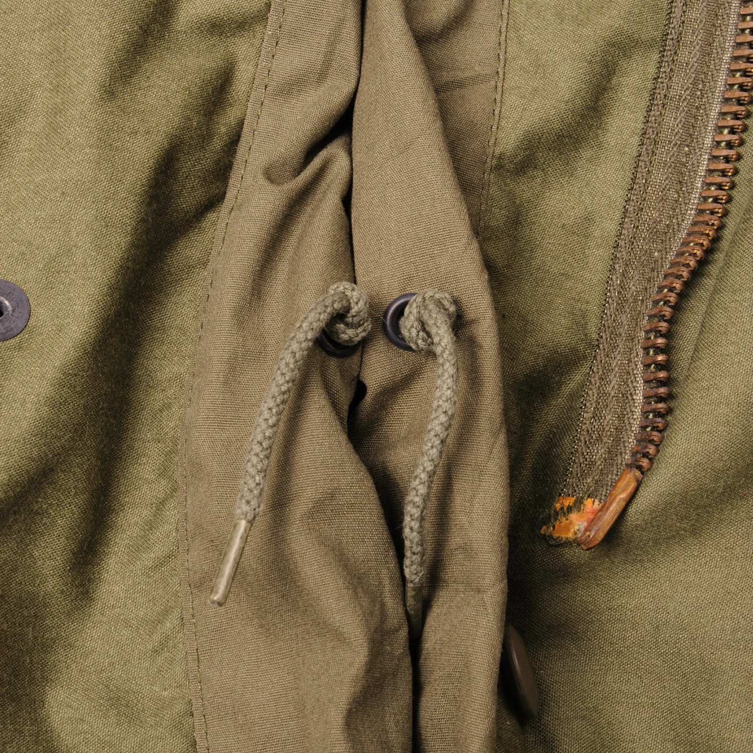 The hip length M1965 cold weather coat was made from OG-107 water repellent and wind resistant cotton-nylon sateen and had a zip front closure and Velcro cuff fasteners. The two bellows type chest pockets and two lower inside hanging pockets were closed by snap fasteners and the hood was zipped into the back of the coat’s rounded collar. Like its M1951 predecessor it had both waist and hem drawstrings and could be fitted with a detachable liner.