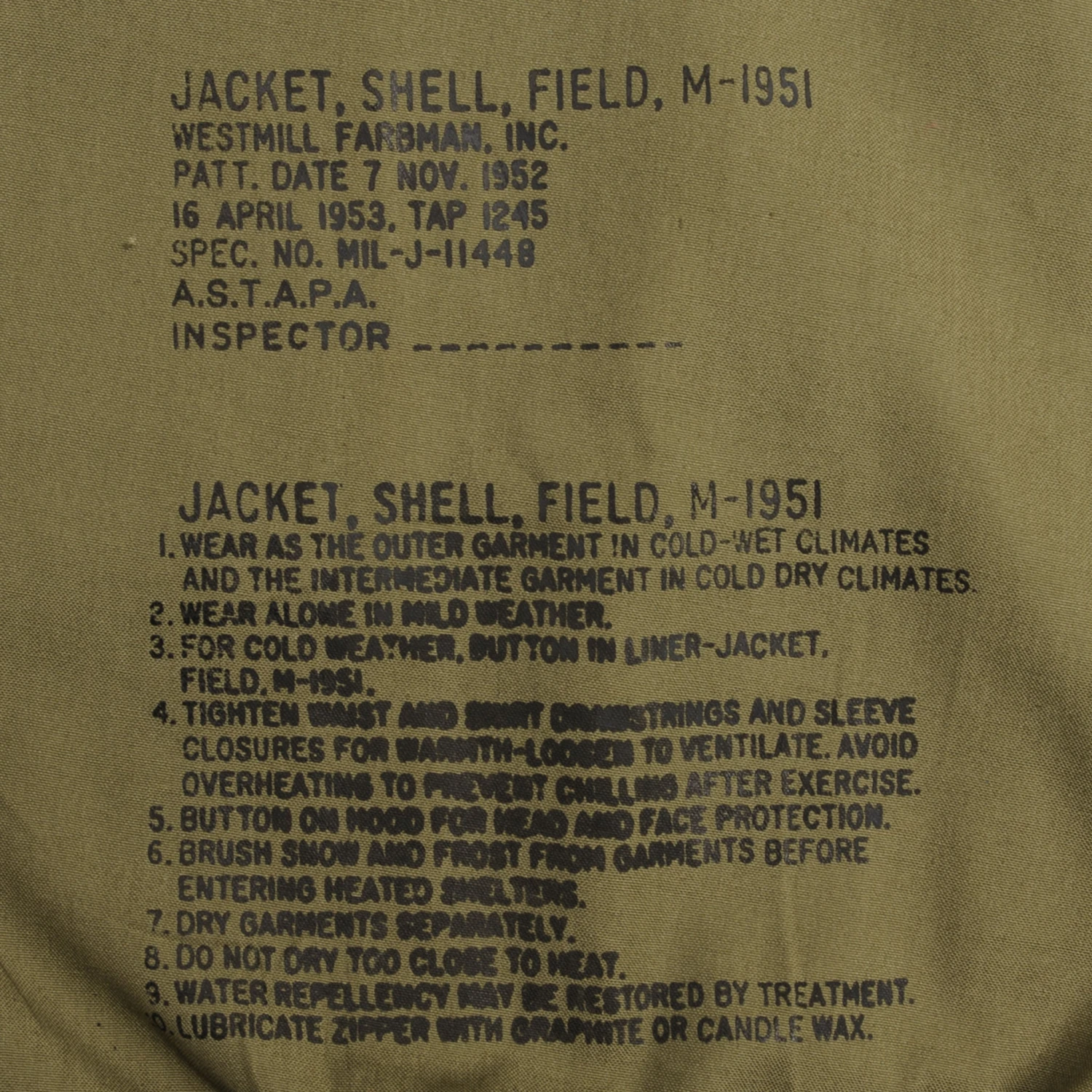 The M-51 M1951 field jacket was an US Army four pockets jacket made of 9-ounce wind resistant, water repellent treated cotton sateen cloth in Olive Green Shade 107 (OG 107).
