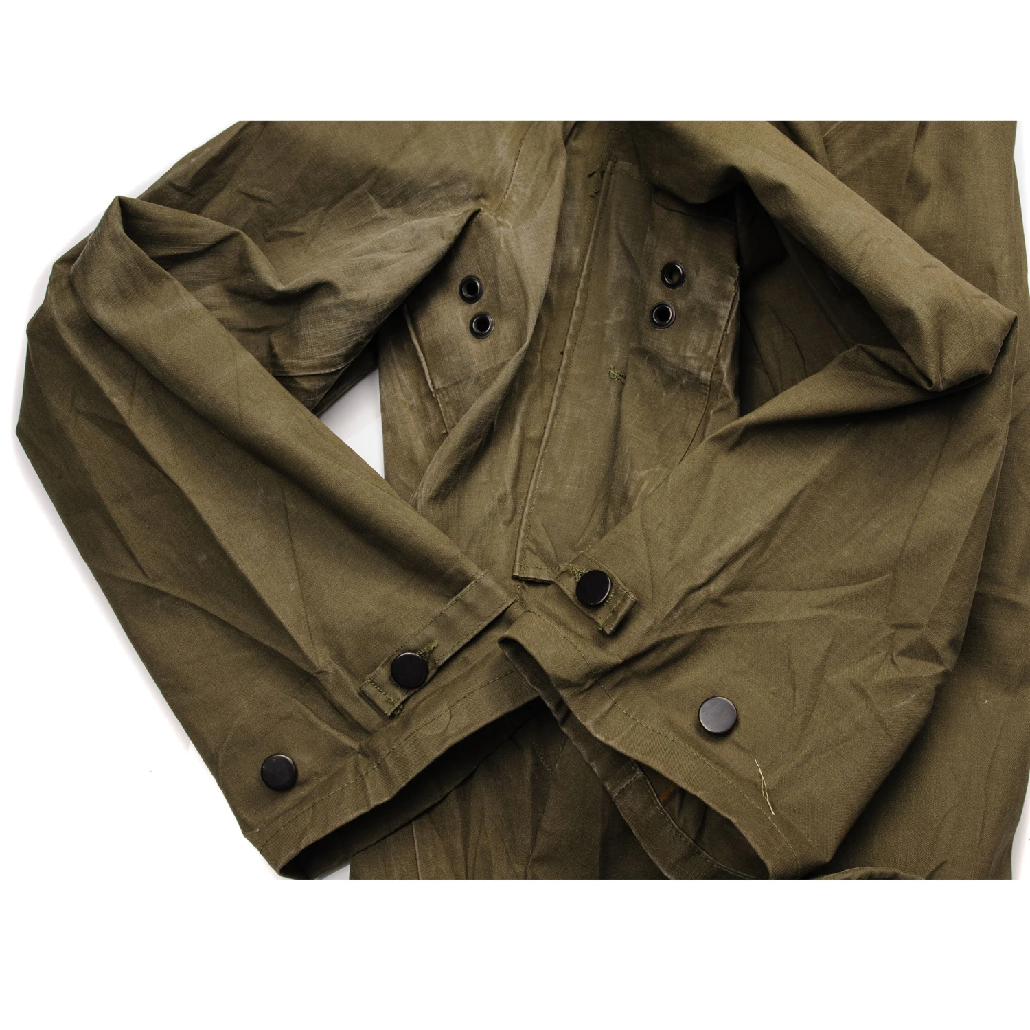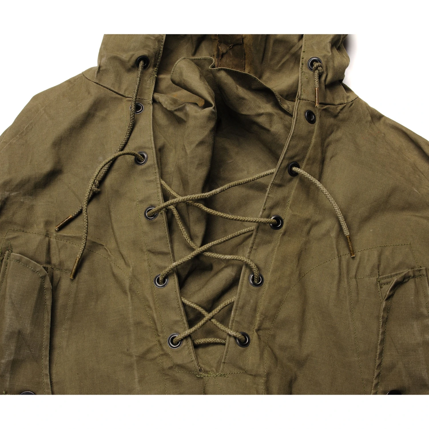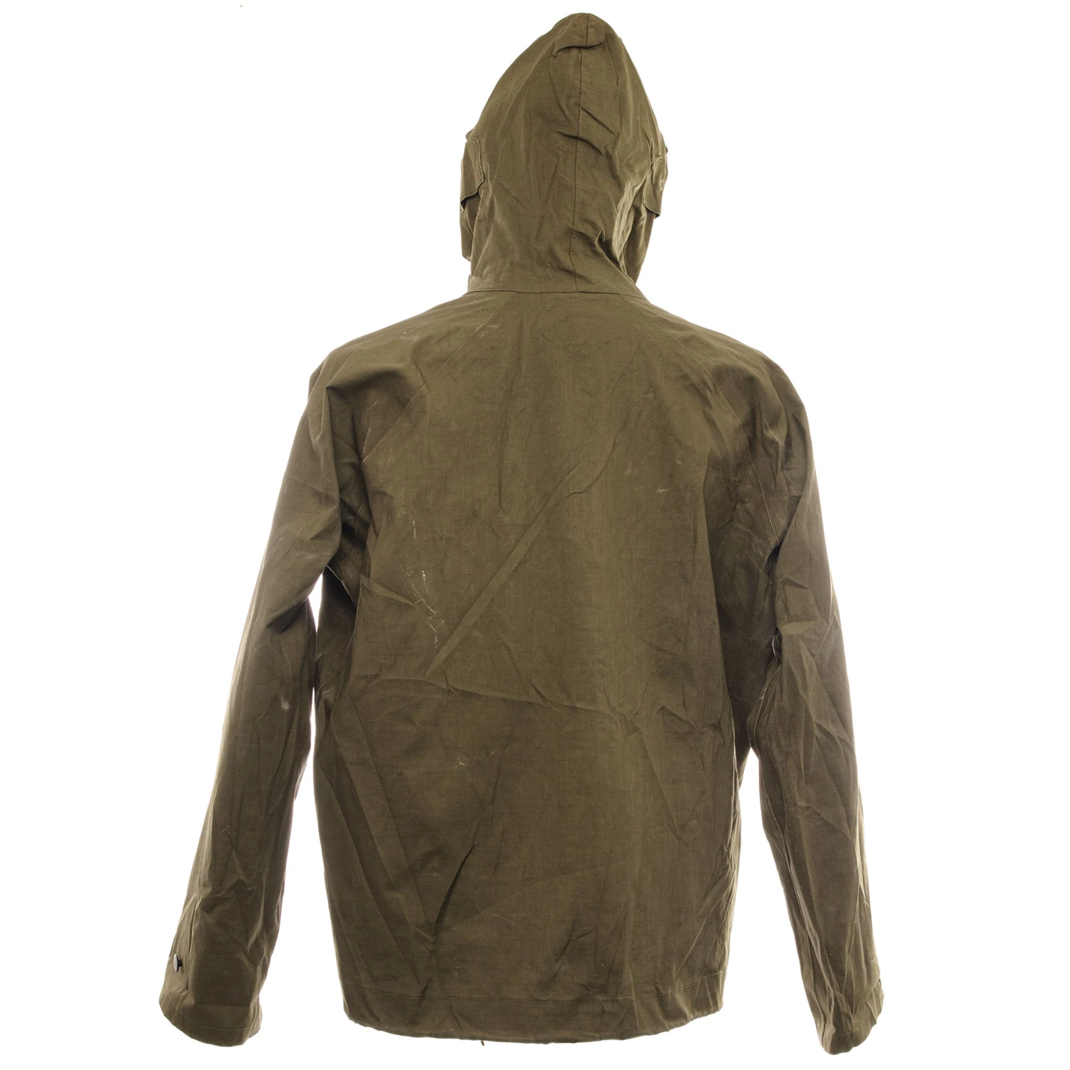 The US Army wet weather pullover was made of cotton duck fabric, had slash side pockets, adjustable cuffs and a hood with an integral peak.
