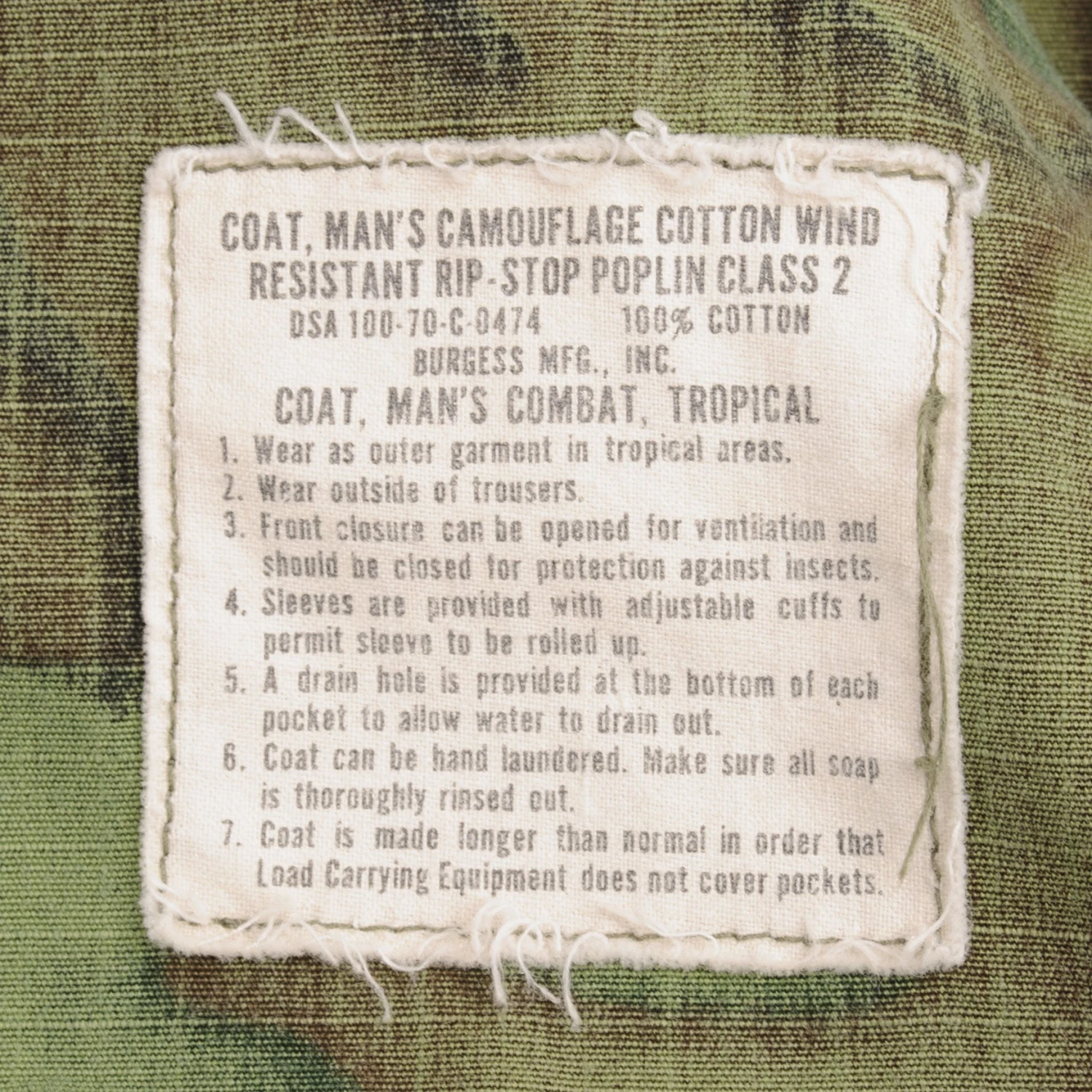 The 3rd major version of the Tropical Combat Coat was first produced in 1966 and had no gas flap, epaulets, waist tabs or pocket drain holes. It was the first jungle jacket to have a back yoke and was made in both OG-107 and ERDL camouflage. Like all prior models it was made from wind-resistant cotton poplin and had pen pockets behind both chest cargo pockets.