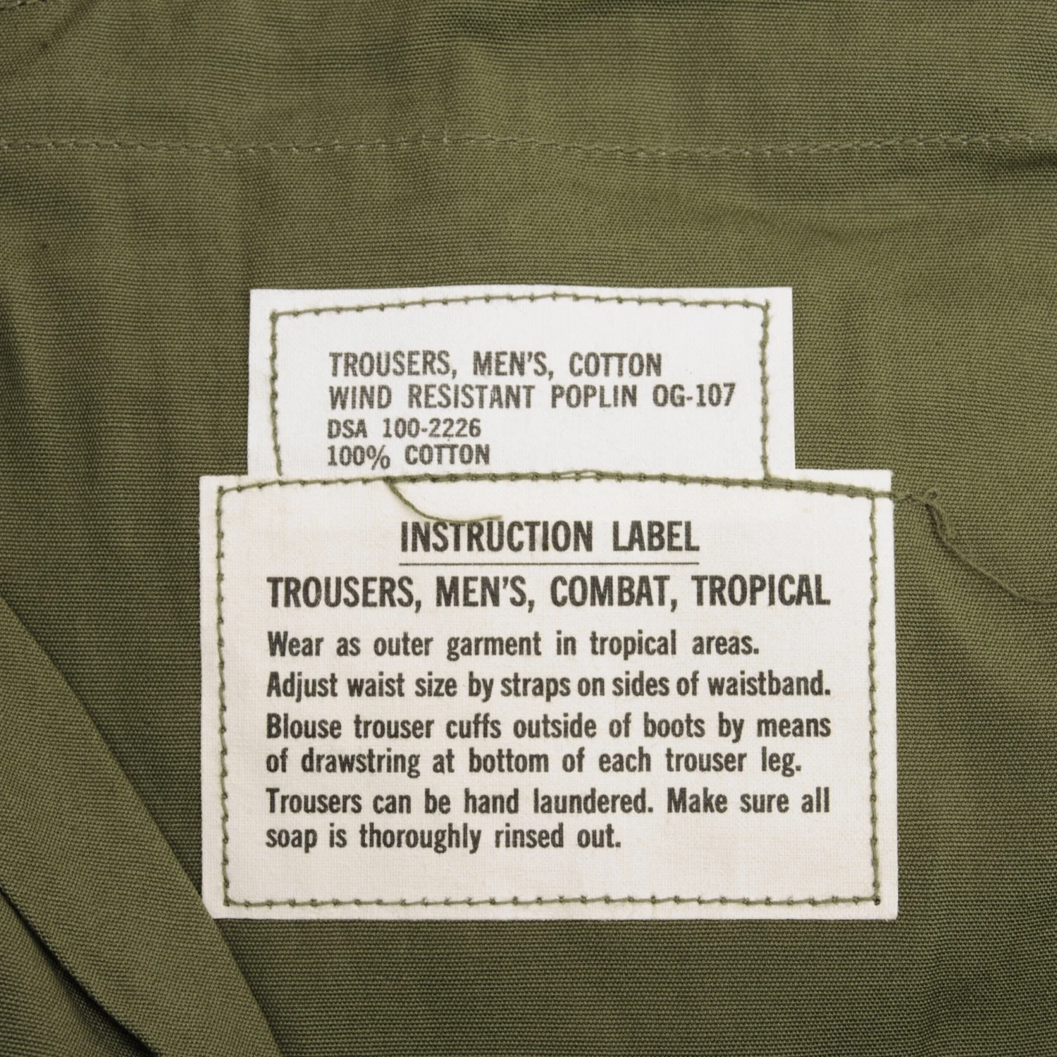 Vintage US Army Tropical Combat Trousers Pants 4Th Pattern Poplin With Wind Resistant Cotton Poplin OG 107 1966 Vietnam War Size Large Short Waist size adjustable and Length size from Crotch to Botton Hem 30in. Deadstock Nos (New Old Stock)
