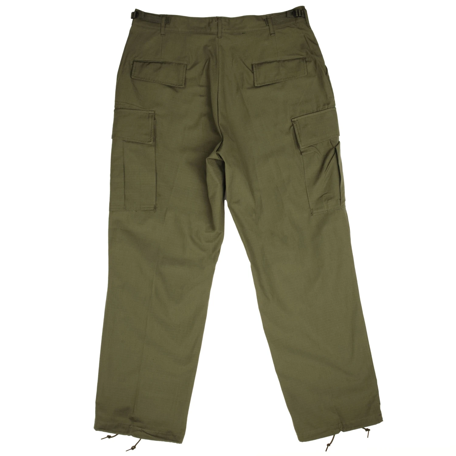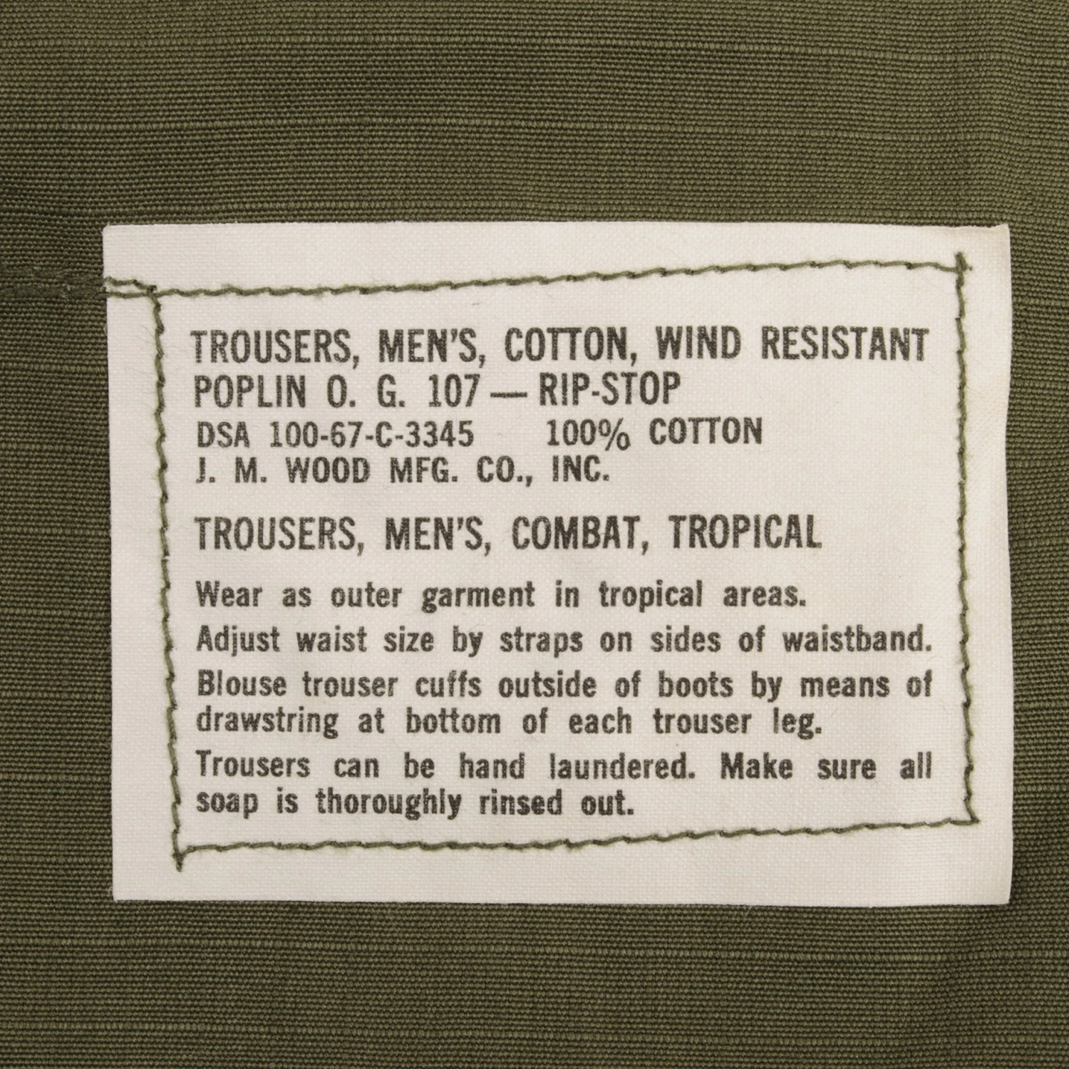Vintage US Army Tropical Combat Trousers Pants 5Th Pattern Rip Stop Poplin With Wind Resistant Cotton Poplin OG 107 1967 Vietnam War Size Large Regular Waist size adjustable and Length size from Crotch to Botton Hem 32in