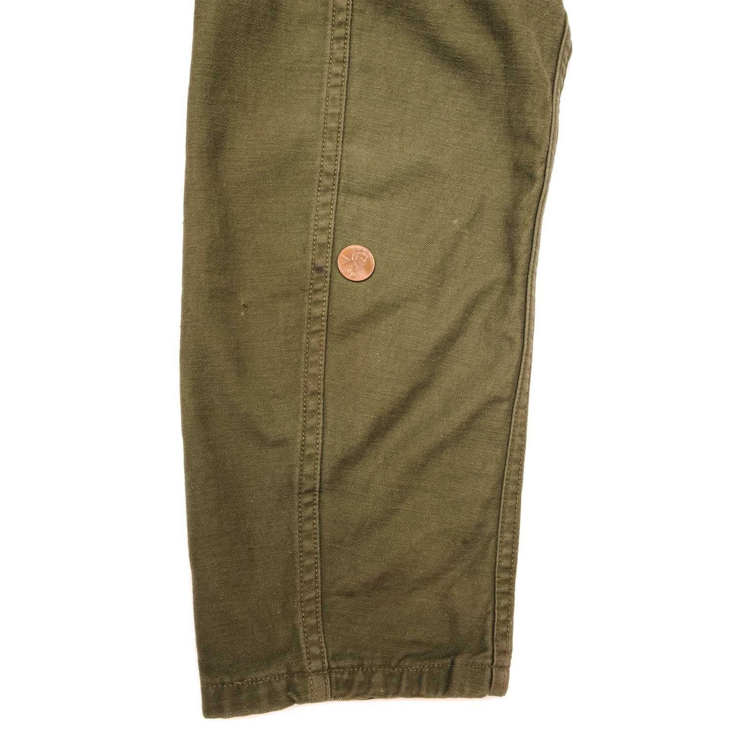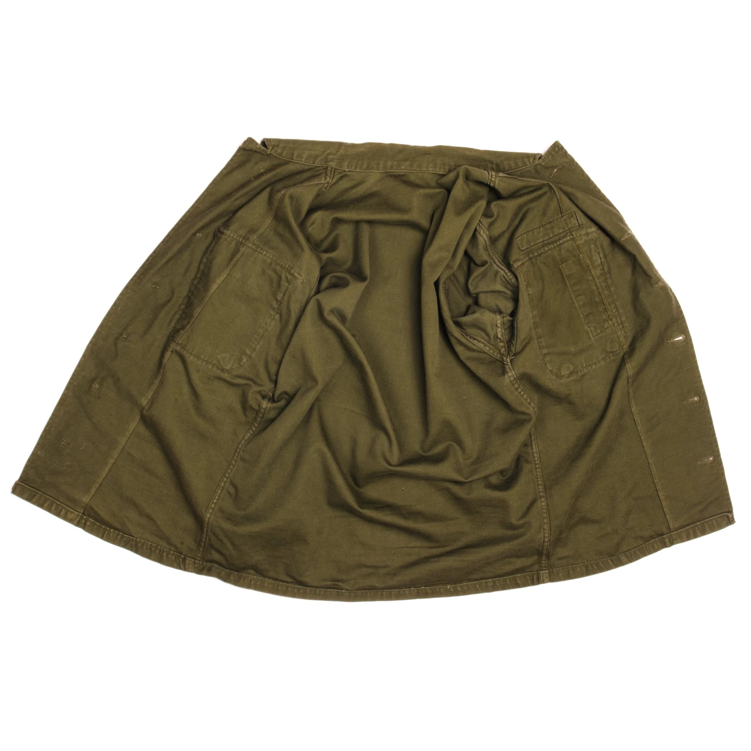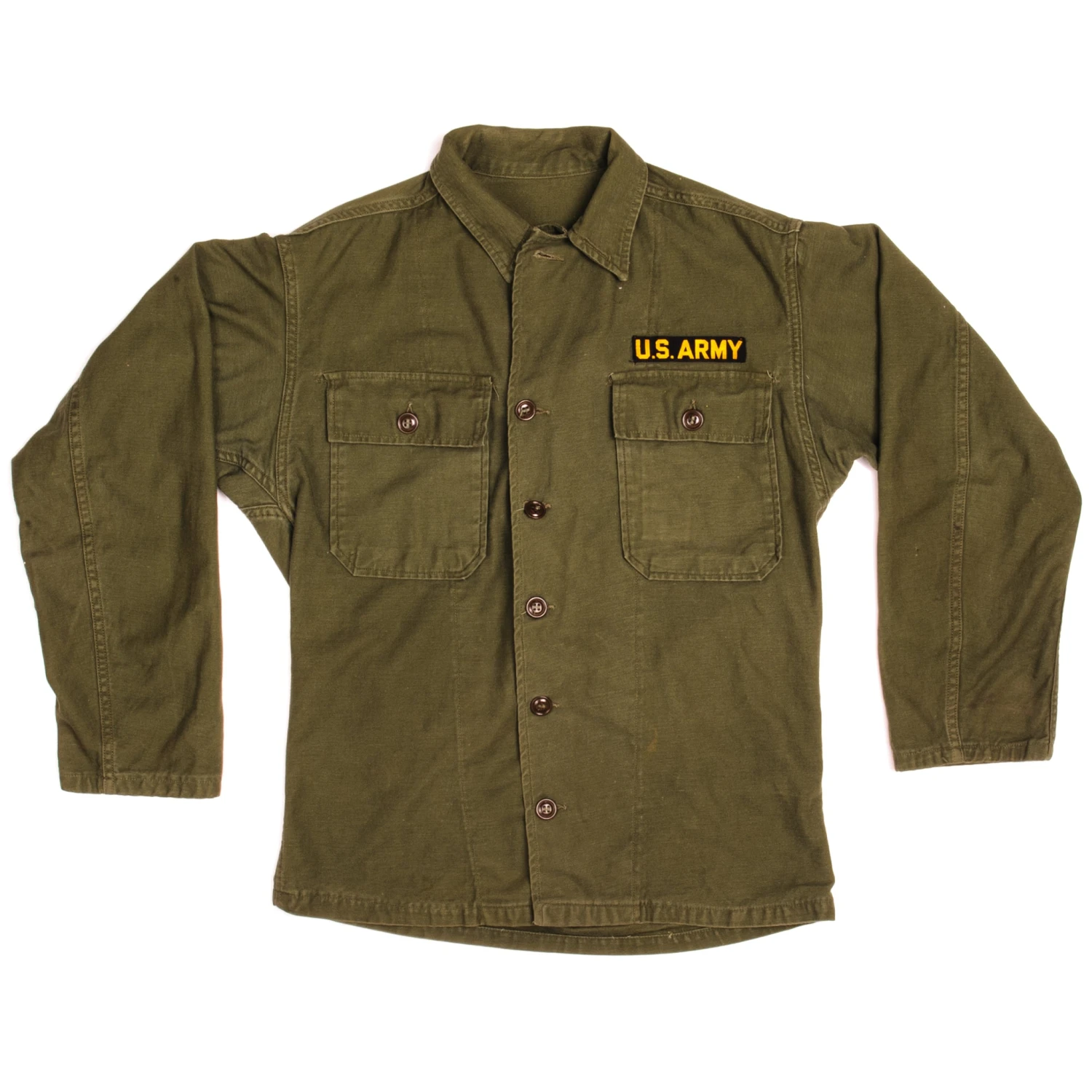 The Army’s first pattern utility shirt was standardized in 1958Â and replaced the near identical utility jacket. It was made from olive green (OG-107) 8.5oz cotton sateen and boasted two patch pockets with straight cut flaps. The shirt also had an unusually low first summary and no summary cuffs.