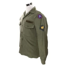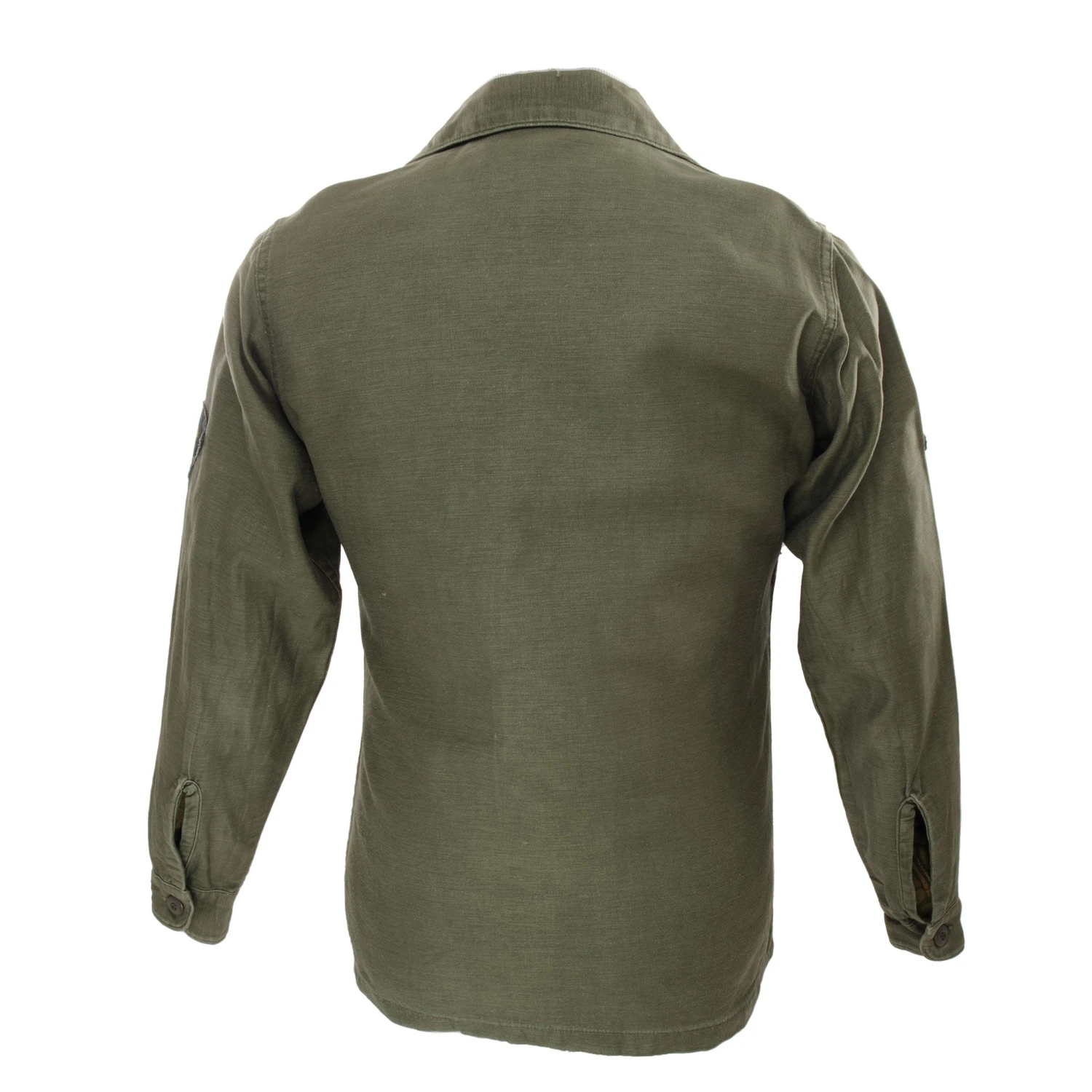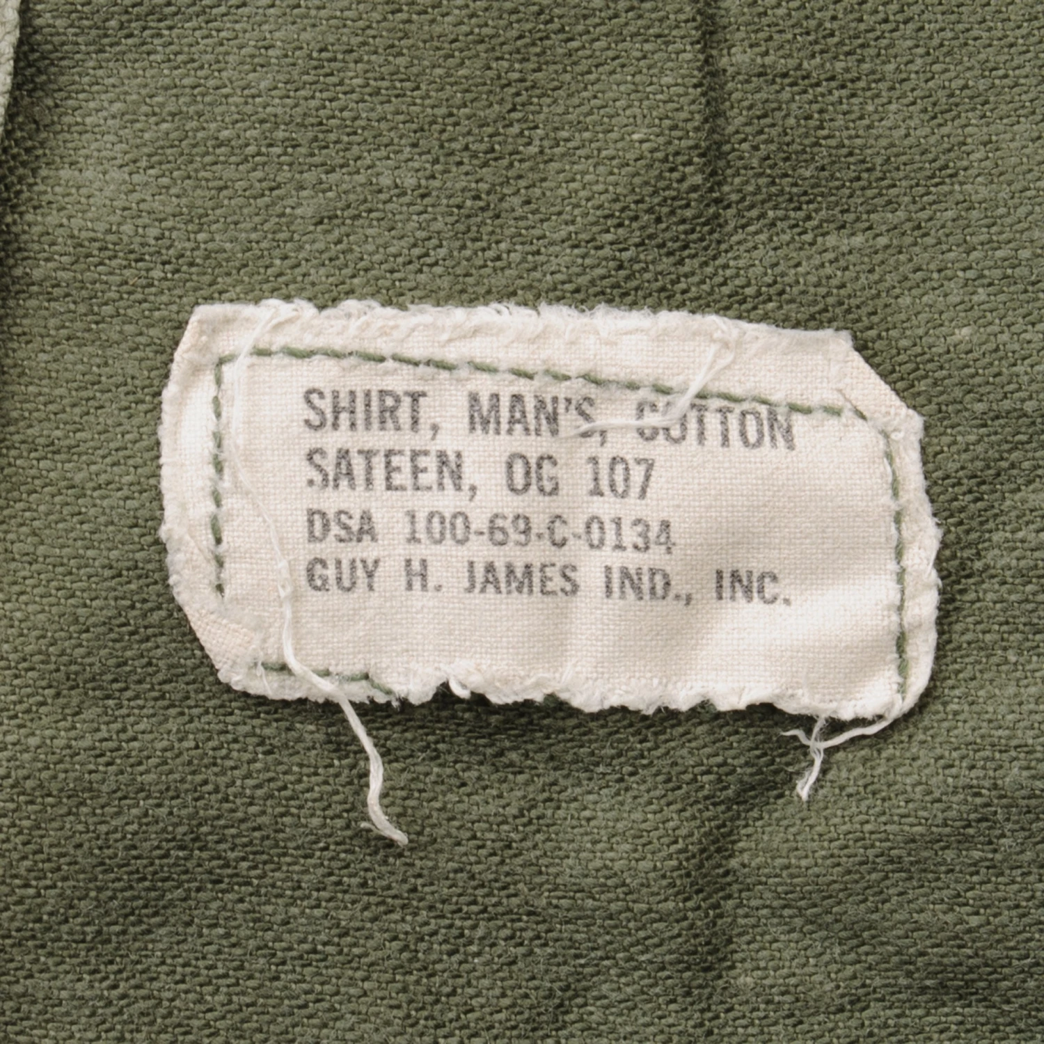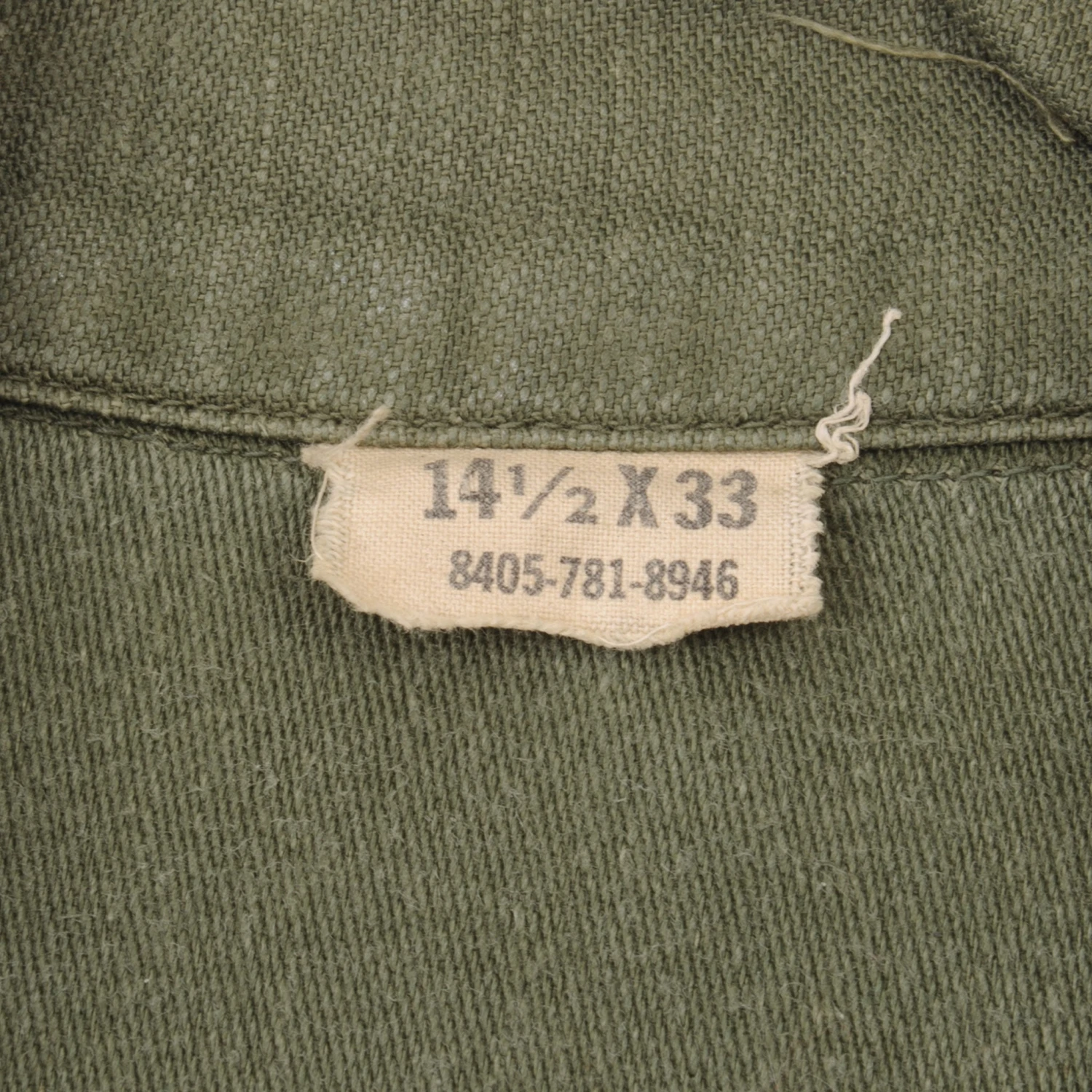The 1964 design of the Utility Shirt featured V-cut pocket flaps, cuffed sleeves and domed plastic summarys. Like its predecessor, it was made from olive green (OG-107) 8.8oz cotton sateen.