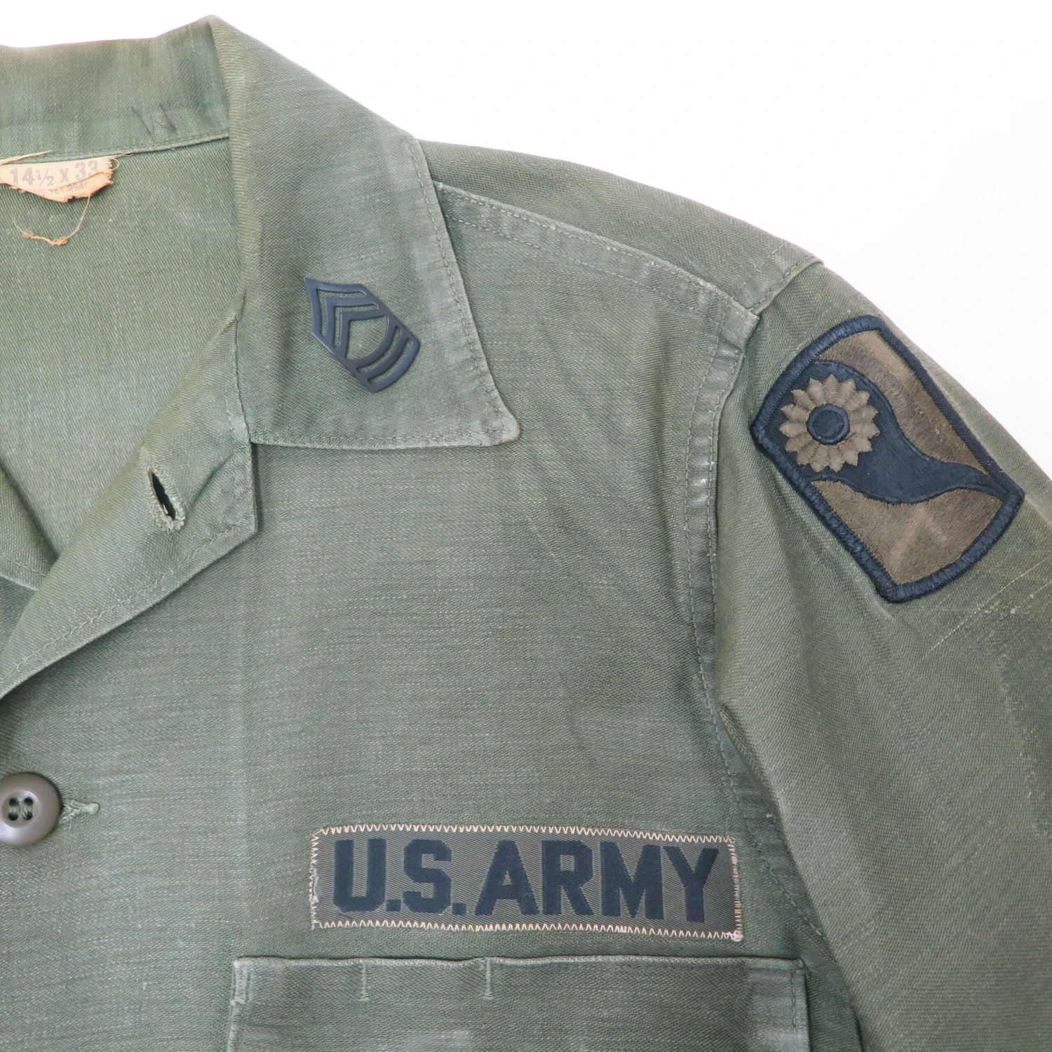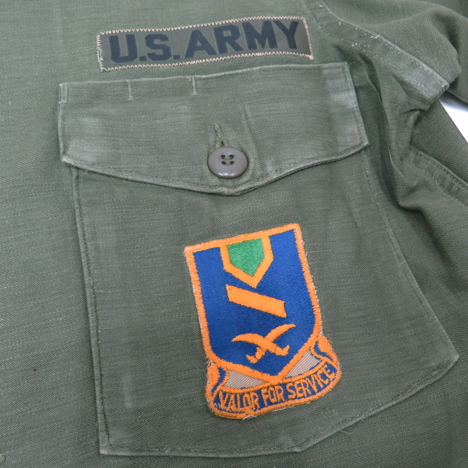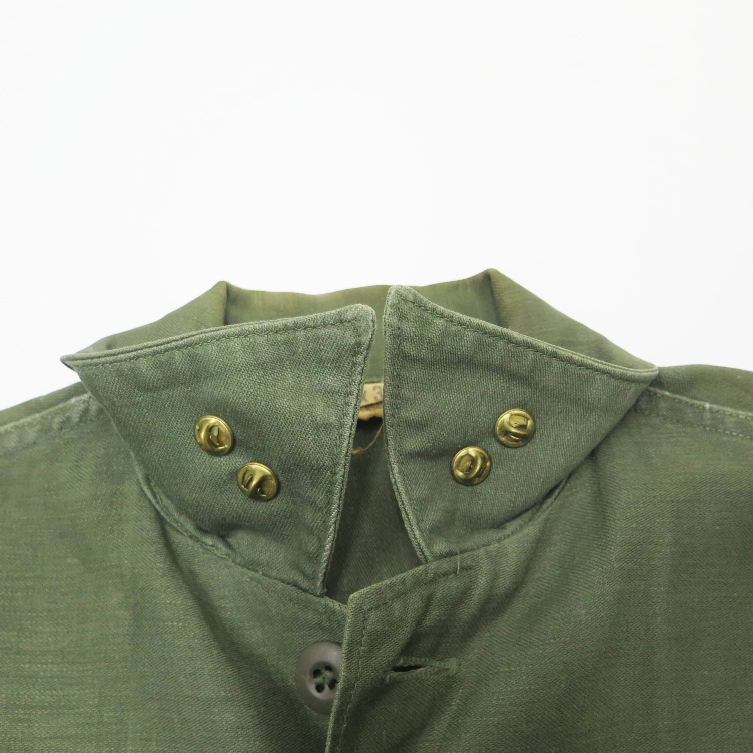 The 1964 design of the Utility Shirt featured V-cut pocket flaps, cuffed sleeves and domed plastic summarys.1 Like its predecessor, it was made from olive green (OG-107) 8.8oz cotton sateen.