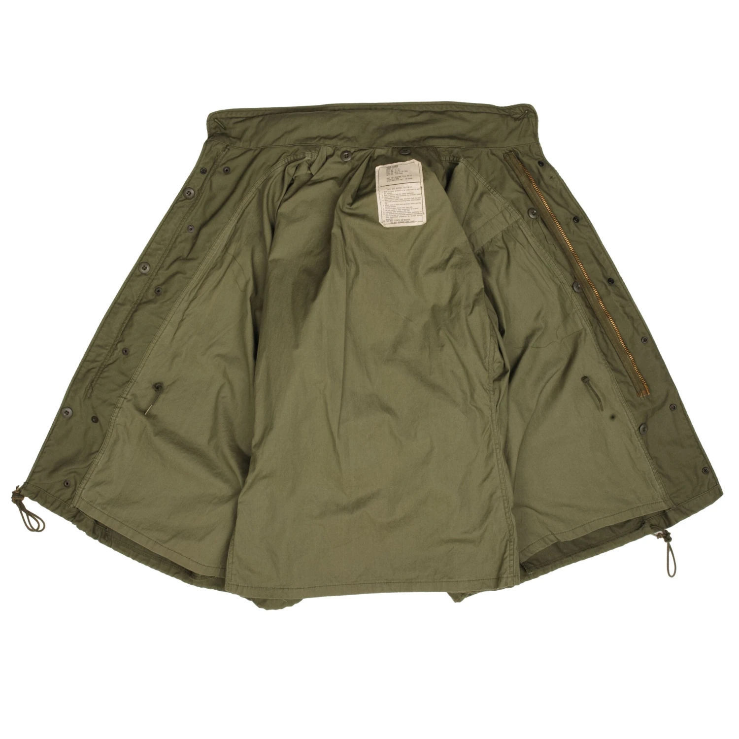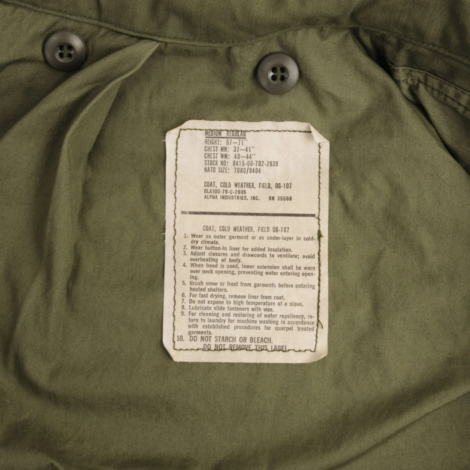The M-1965 jacket was initially designed by Alpha Industries and was made from OG-107 (Olive Green Shade 107) water repellent and wind resistant cotton-nylon sateen. The fabrics was made by Burlington Fabrics.